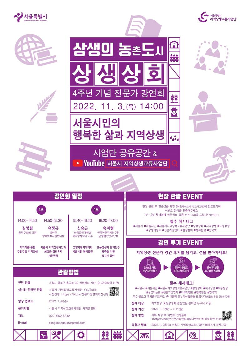 서울시민의 행복한 삶과 지역상생 전문가 강연회 '서울시민의 행복한 삶과 지역상생'이라는 주제로 개최됩니다. 도농교류 및 지역상생 사업이 서울시민 삶의 질 향상에 어떻게 기여하고 있는지 전문가의 강연을 들어보세요. 【행사 개요】 ■ 신청 대상: 도농상생, 지역상생에 관심있는 분이면 누구나 참여 가능! ■ 신청 기간: 2022. 10. 24.(월) \~ 11. 2.(수) ■ 신청 링크: https://bit.ly/전문가강연회사전신청 ■ 강연회 일정: 2022. 11. 3.(목) 14:00 ■ 관람방법: 현장관람, 실시간 온라인 관람 ※ 강연 종료 후 서울시지역상생교류사업단 YouTube에서도 관람 가능합니다. 영상 업로드 일정: 2022. 11. 9.(수) ■ 강연 내용: 1.김영림( 동작구의회 의원) - 먹거리를 통한 주민주도 지역상생 2.유정규(의성군 행복의성지원센터장) - 서울시 지역상생사업과 의성군 청년유치 지원정책 3.신승근(한국공학대학교 복지행정학과 교수) - 고향사랑기부제와 서울시민 복리증진 4.송미령(한국농촌경제연구원 균형발전연구단장) - 도농상생의 관계인구 확충을 위한 N가지 상상 【EVENT】 Ⅰ. 현장 관람 후 관람 인증샷을 개인 SNS(페이스북, 인스타그램)에 업로드하여 이벤트 참여를 인증해주세요. 1부∙2부 각 5분께 상생상회 상품(1만원 내외)을 드립니다. Ⅱ. 도농상생 전문가 강연 네이버 블로그 후기 남기고, 선물 받아가세요! 우수 블로그 후기를 신청하여 총 15분께 온누리상품권을 드립니다 <10만원 5명, 5만원 10명> ■ 후기이벤트 참여링크: https://bit.ly/상생의농도리뷰이벤트 【기타 사항】 ■ 개인정보이용동의 및 수집은 사전신청을 위한 필수 항목입니다. 【문의 사항】 ■ 서울시지역상생교류사업단 기획운영팀TEL. 070-4162-5342 / E-mail. sangsaengplan@gmail.com