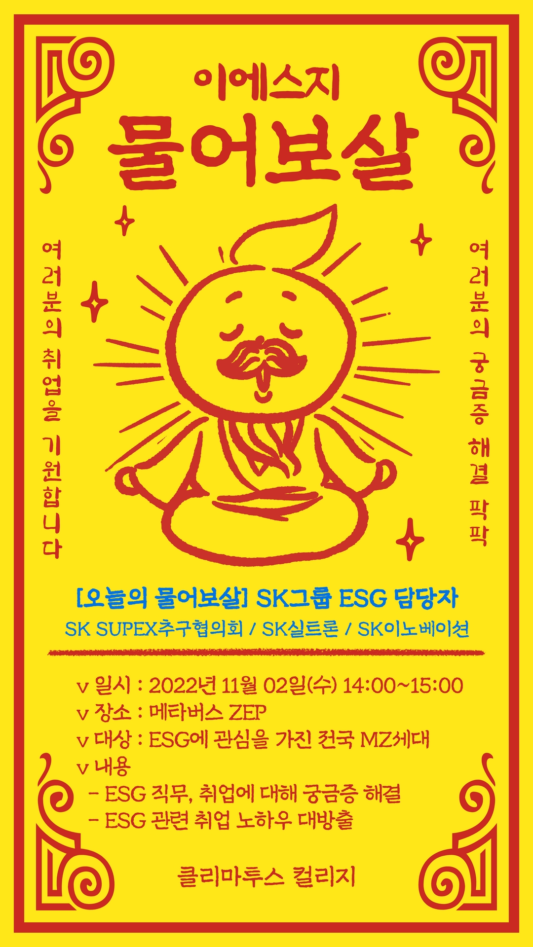 그동안 마땅히 물어볼 곳이 없었던 ESG와 관련된 모든 궁금증! 그 궁금증을 속 시원히 해결해 줄 세 명의 보살을 한 자리에 모셨습니다. 'SK그룹 ESG 담당자(SK SUPEX추구협의회 / SK 실트론 / SK이노베이션)'와 함께하는 미니 토크 콘서트에 여러분을 초대합니다! ESG 직무, 취업 노하우는 물론 사내 문화에 대한 팁/가이드를 얻을 수 있는 기회, 클리마투스 컬리지와 함께 해요!
