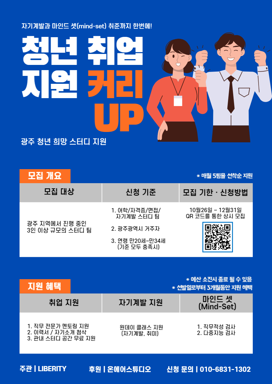 ➰ 모집 기한 - 10월26일 \~ 12월31일 ➰ 신청 기준 - 광주 지역에서 진행 중인 3인 이상 규모의 스터디 팀 - 어학/자격증/면접/자기계발 분야의 스터디 팀 - 스터디원 연령이 만20세\~만34세 사이 ➰ 신청 방법 - 아래 구글 폼 작성 후 제출 신성서 클릭! ➰ 기타 문의 - H.P \| 010-6831-1302 - E-mail \| sjg207@naver.com ❗️ 신청 기준은 모두 충족해야 지원이 가능 합니다 ❗️ 매월 5팀을 선착순으로 선발하고 있으며 최대 3개월까지 혜택을 지원해드립니다 ❗️ 예산 소진으로 조기 종료될 수 있습니다