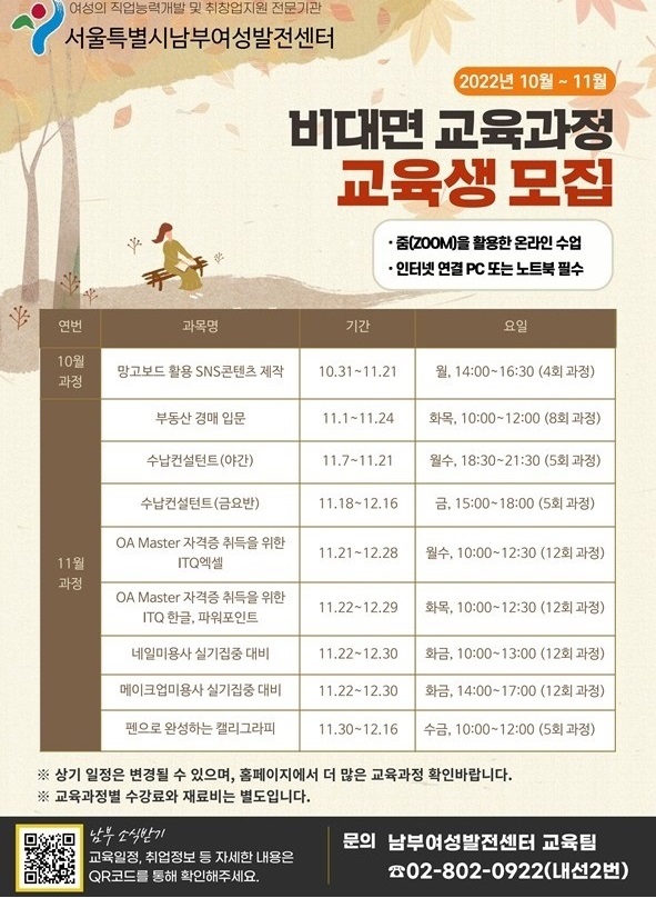 [남부여성발전센터] 안녕하세요. 남부여성발전센터에서는 10월\~11월 비대면 교육과정 교육생을 모집합니다. 관심있으신 분들의 많은 참여를 부탁드립니다. *신청기간 : 선착순 접수중 *신청방법 : 인터넷 접수 (남부여성발전센터 홈페이지 → 로그인 → 수강신청) 또는 내방접수 *수강료 : 강좌마다 상이