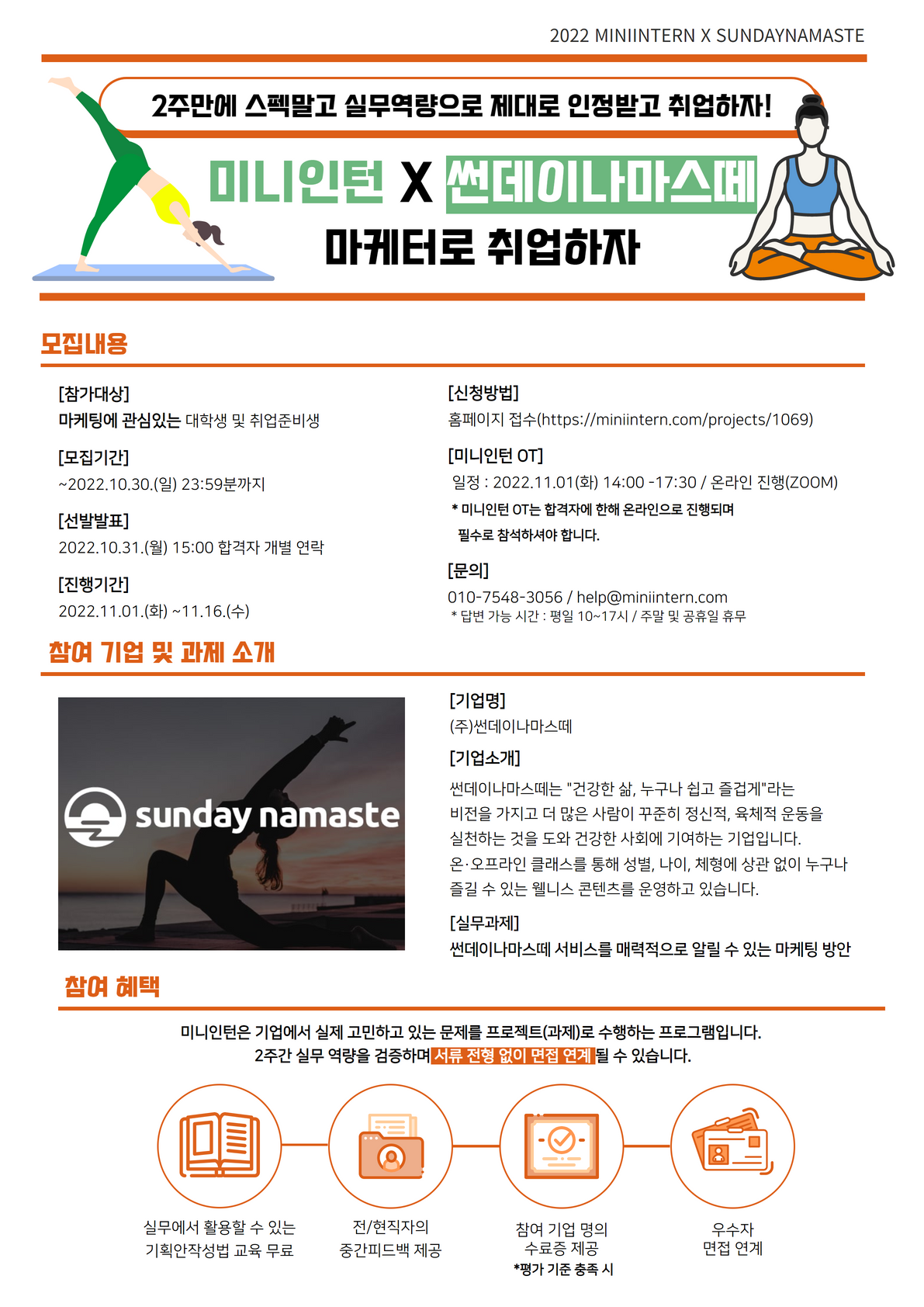 ▶ 모집 기간 \~2022.10.30. (일) 23:59까지 ▶ 프로그램 선발 발표 \~2022.10.31. (월) 15:00 *합격자에 한하여 개별 문자 연락 ▶ 모집 대상 - 썬데이나마스떼 입사지원 희망자 - 졸업자 또는 졸업예정자 - 콘텐츠 마케팅 직무에 관심이 있는 분 ▶ 과제 수행 기간 - 2022.11.01. (화) \~ 2022.11.16. (수) ▶ 미니인턴 OT 일정 (필수참여) - 일시: 2022.11.01. (화) 14:00 \~ 17:30 - 장소: 온라인 (ZOOM) ▶ 미니인턴 OT 교육 내용 - 미니인턴 오리엔테이션 - 기업 소개 및 과제 안내 - 기획안 작성법 교육 - Q&A 및 마무리 ▶ 개별 과제 소개 (OT 후 2주간) 썬데이나마스떼 서비스를 매력적으로 알릴 수 있는 콘텐츠 마케팅 방안 ▶참가 혜택 - 우수자 채용 연계 - 직무 역량 강화 교육 무료 진행 - N년차 전/현직자의 중간피드백 무료 제공 - 수료 시\, 참여 기업명의 수료증 발급