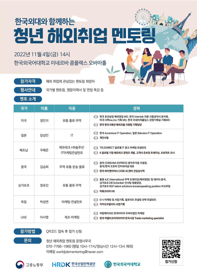 안녕하세요\~! 한국산업인력공단에서 청년 해외취업 국가별 그룹 멘토링을 진행합니다!!! 코로나로 인해 대면 행사가 힘든 요즘 시기에 해외 취업을 경험한 멘토들과 오프라인에서 진솔한 이야기를 나눌수 있는 시간을 가질 수 있습니다. 선착순으로 참여 신청을 받고 있으니 해외취업에 관심이 있는 분들은 많은 참여 바랍니다! <한국외대와 함께하는 청년 해외취업 멘토링> 💡 장소 : 한국외대 미네르바 콤플레스 오바마홀 💡 일시 : 2022년 11월 4일(금) 14시 💡 참가대상 : 해외 취업에 관심있는 멘토링 희망자 (선착순 200명) 💡 행사안내 : 국가별 멘토링, 영문이력서 및 면접 특강 등 💡 멘토링 국가 : 미국 / 일본 / 베트남 / 중국 / 싱가포르 / 독일 / UAE 💡 참가방법: https://url.kr/wfdyxt 접속 후 참가 신청 (QR코드와 동일) 해외취업을 희망하시는 청년들의 성공을 위하여 선배 멘토들의 지식과 노하우를 들을 수 있는 자리이니 관심이 있으신 분들은 참여해주세요\~! 청년 해외취업 멘토링 운영사무국 T. 070-7766-1960 E. worldjobmentoring@naver.com (평일 10시-17시 / 점심시간 12시-13시 제외)