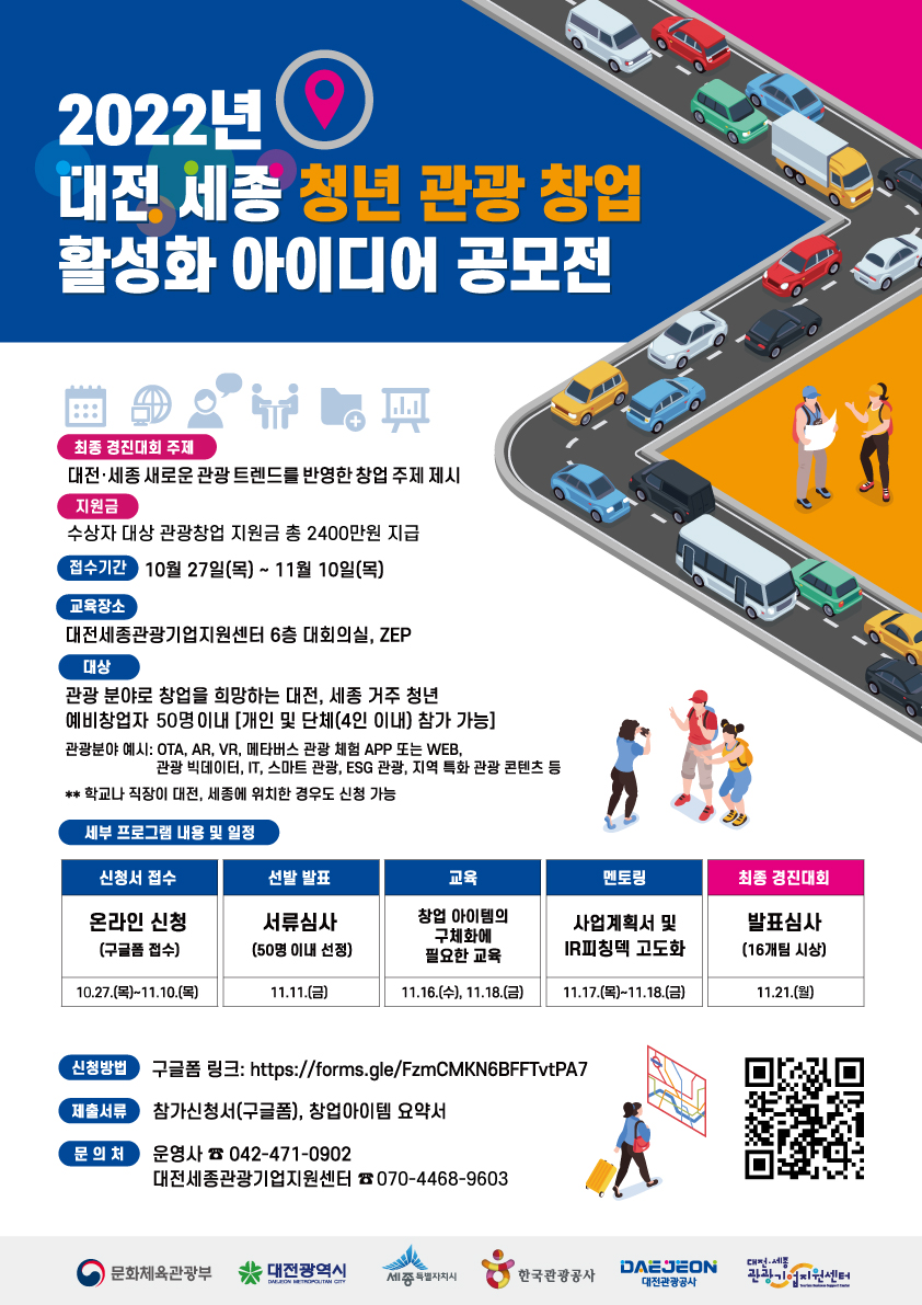 ● 교육 기간: 11.16.(월)\~18.(금) ● 장소: (오프라인) 대전세종관광기업지원센터 6층 대회의실, (온라인) ZEP ● 최종 경진대회: 11.21.(월) ● 최종 경진대회 시상금: 총 2,400만원(수상 16팀 이내) ● 신청 방법: 대전관광공사 홈페이지에서 신청서류를 다운받아 홍보포스터 우측하단의 QR코드에서 온라인 신청!