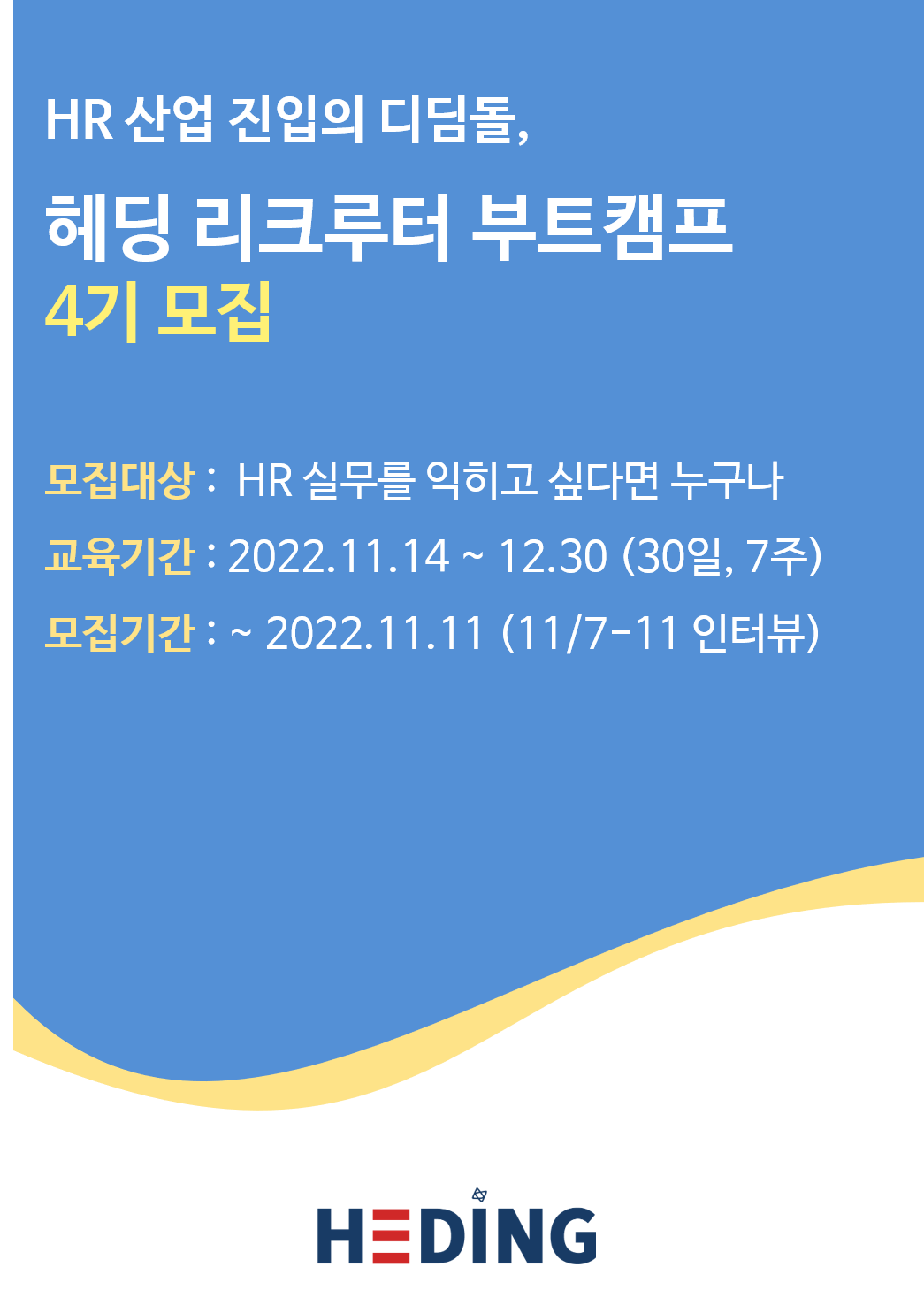리크루터 부트캠프는 인재채용 플랫폼 HEDING에서 진행하는 프로그램으로, HR 산업 진출을 희망하는 취준생분들께 산업에 대한 이해와 리크루터 업무 전반을 교육해드리고 실무 경험도 쌓을 수 있도록 도와드리는 프로그램입니다.