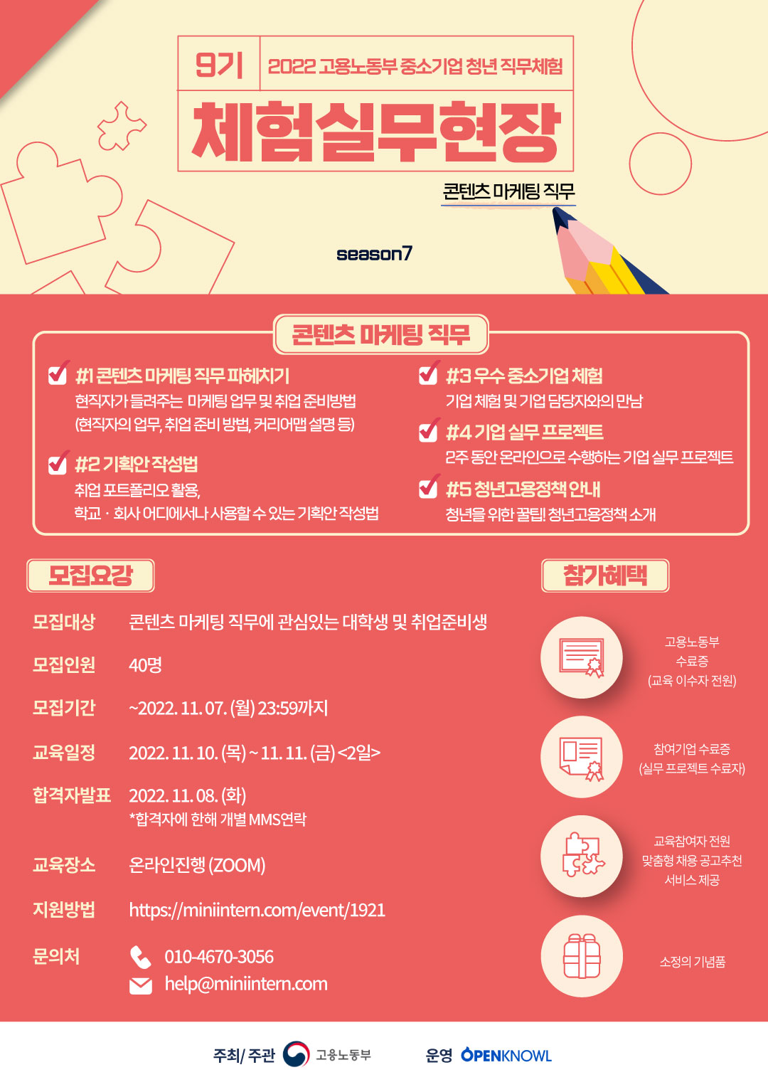 ▷활동혜택 - 고용노동부 수료증 - 참가 기업 수료증 - 콘텐츠 마케팅 직무에 대한 실무 프로젝트 경험 - 지원 사업 안내 및 연계 - 소정의 기념품