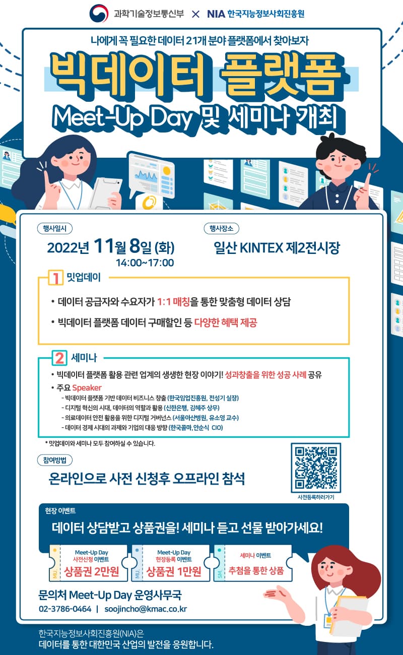 📊 나에게 꼭 필요한 데이터 21개 분야 플랫폼에서 찾아보자! 빅데이터 플랫폼 Meet-Up Day 및 세미나가 11/8일(화) 일산 킨텍스 제2전시장에서 개최됩니다!