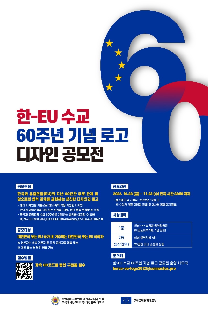 - 한-EU 수교 60주년 기념 로고 공모전 운영 사무국: korea-eu-logo2023@connectus.pro