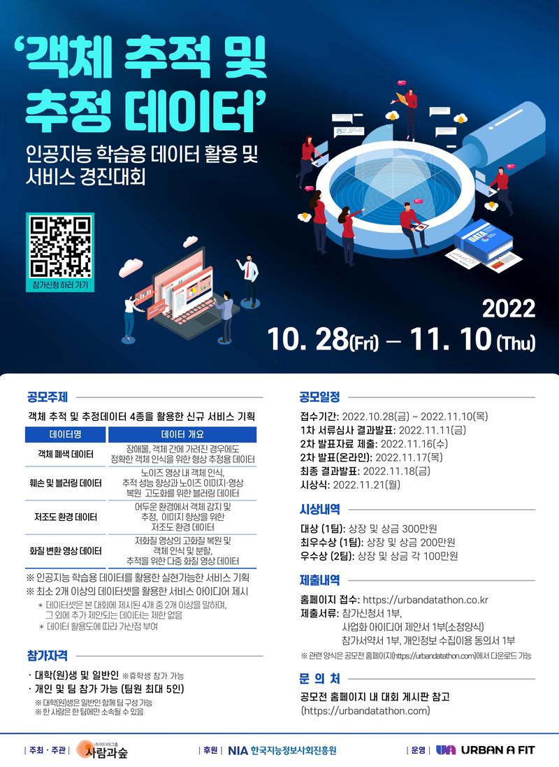 ● 공모 일정 - 접수기간: 2022년 10월 28일(금) \~ 11월 10일(목) 17:00 - 1차 서류심사 결과발표: 2022년 11월 11일(금) - 2차 발표자료 제출: 2022년 11월 16일(수) - 2차 발표(온라인): 2022년 11월 17일(목) - 최종 결과발표: 2022년 11월 18일(금) - 시상식: 2022년 11월 21일(월) ※ 상기 일정은 주최 측의 사정에 의해 변경될 수 있습니다.