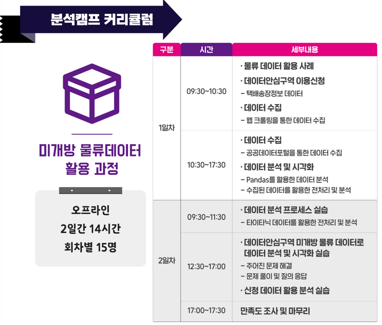 ✨물류 데이터 활용 과정✨ ✅ 소 개 : 데이터안심구역의 미개방 물류 데이터(택배송장 정보 데이터)를 Python을 활용하여 데이터 탐색 및 수집, 분석해보는 분석캠프 ✅ 일 정 : 11월 3일(목) \~ 11월 4일(금), 9시 30분\~17시 30분, 2일간 14시간 운영 ✅ 장 소 : 한국데이터산업진흥원 7F 데이터안심구역 교육장 및 분석랩 ✅ 신청기간 : 10월 17일(월) \~ 11월 2일(수)