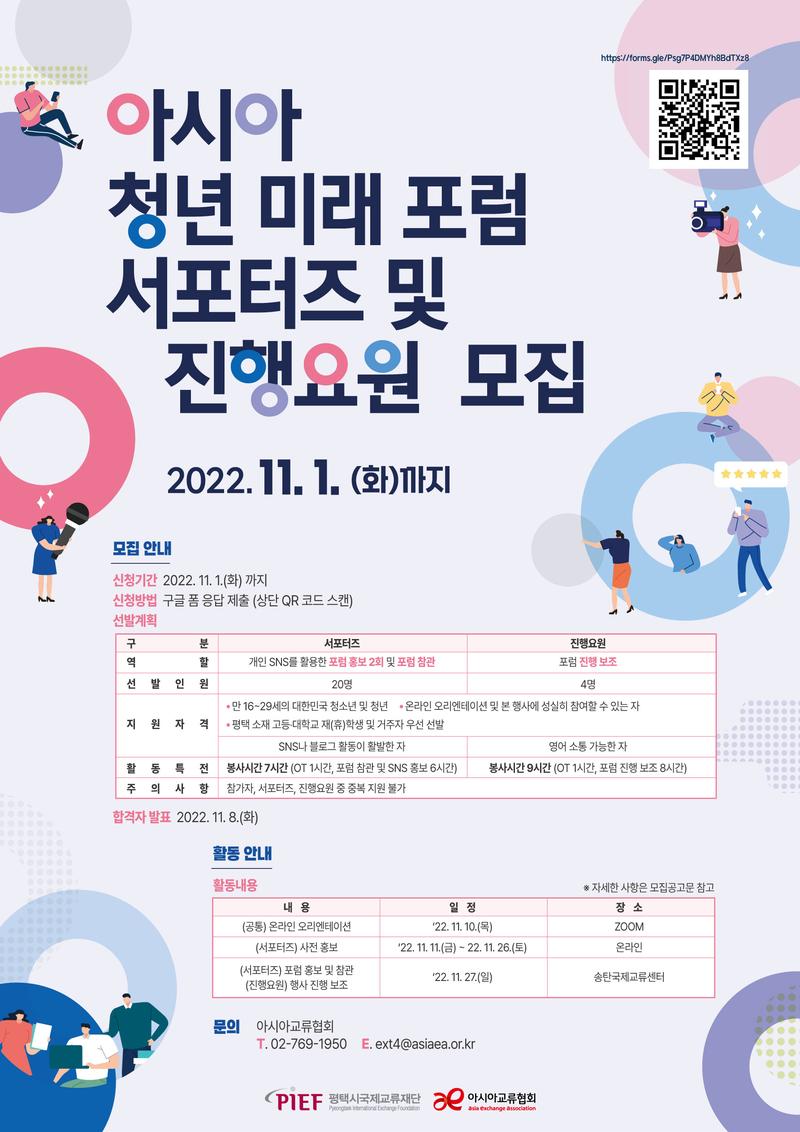 아시아교류협회는 평택시, 평택시국제교류재단과 함께 올해 11월 27일(일)에 「아시아 청년 미래 포럼(Asia Youth Future Forum)」을 개최합니다. 이에, 포럼의 홍보를 맡을 서포터즈와 진행을 보조할 진행요원을 모집하고 있으니, 많은 관심과 지원 부탁드립니다. 서류 접수 마감일은 11월 1일(화)이며, 자세한 내용은 아시아교류협회 홈페이지(asiaea.or.kr)에서 확인해 주시기 바랍니다. 지원링크: https://forms.gle/Psg7P4DMYh8BdTXz8