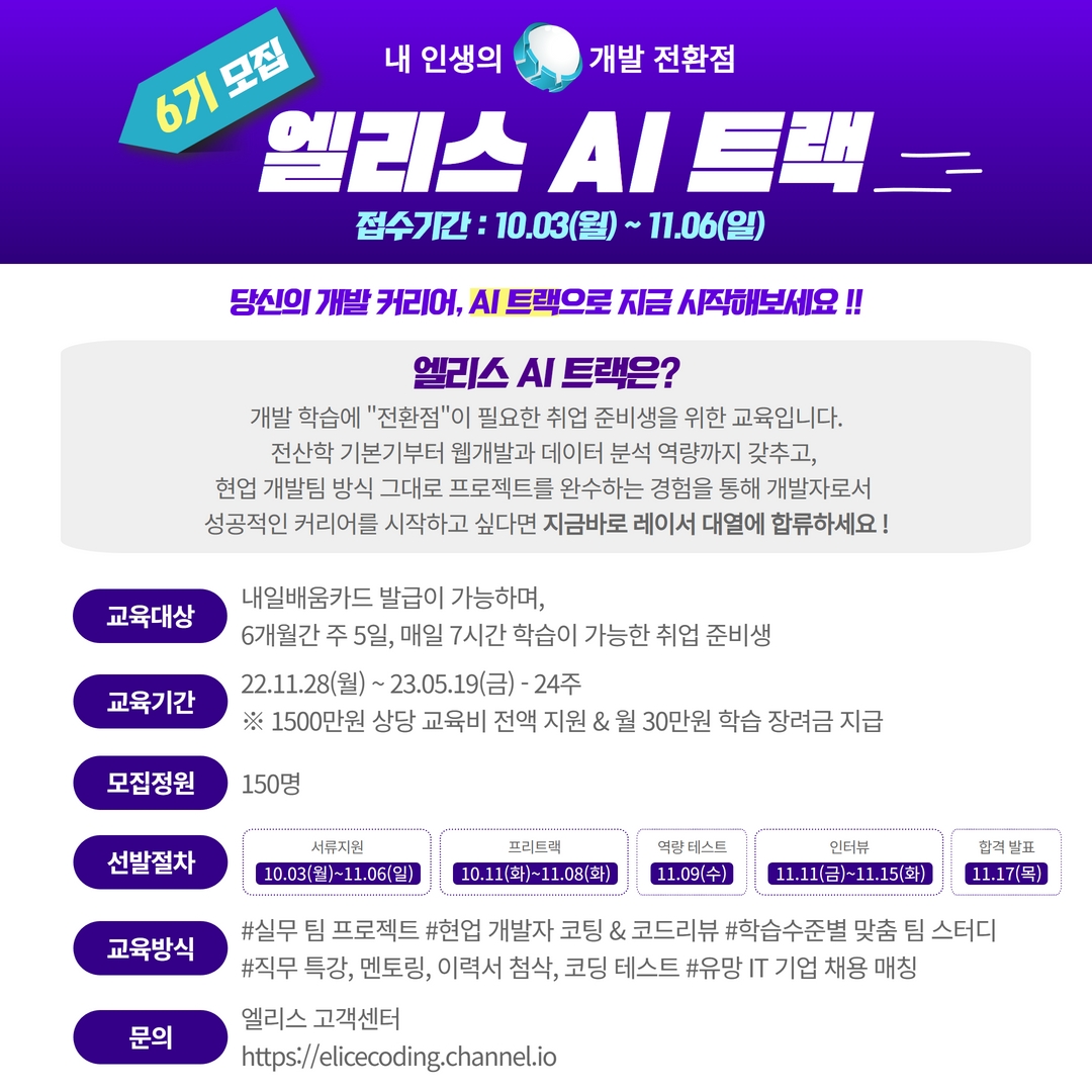 - 모집기간 2022.11.06(월)까지 홈페이지 접수 : https://elice.io/