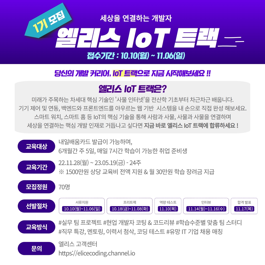[2] IoT 트랙 (70명) 지원기간 : 10.10(월)\~11.06(일) 전산학 기본기부터 웹 개발 역량까지 갖추고 사물인터넷의 핵심 기술을 기반으로 웹 기반 통합 제어 시스템을 개발하는 트랙