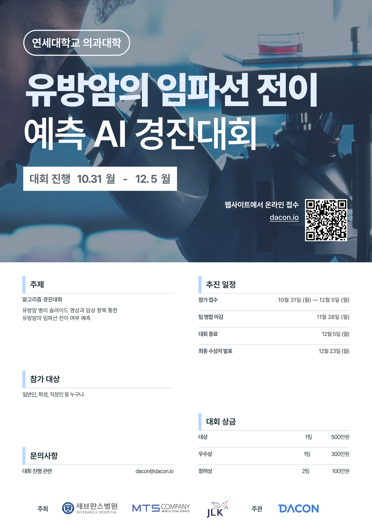 ○ 응모 주제 인공지능 데이터 분석 및 예측 알고리즘 개발 AI 경진대회 ○ 공모전 사이트 링크 https://dacon.io/competitions/official/236011/overview/description ○ 응모자격 일반인, 학생, 직장인 등 누구나 참가 가능 ○ 시상 내역 총 상금 총 상금 1000만원 대상 (1팀) - 500만원 우수상 (1팀) - 300만원 장려상 (2팀) - 100만원 ○ 대회 주제 유방암 병리 슬라이드 영상과 임상 항목을 통한 유방암의 임파선 전이 여부 예측 ○ 대회 일정 2022년 10월 31일 (월) \~ 2022년 12월 05일 (월) ○ 주최 / 후원 / 주관 - 주최: 연세대학교 의과대학\, JLK\, MTS - 후원: 보건산업진흥원 - 주관: 데이콘([dacon@dacon.io](mail to : dacon@dacon.io))