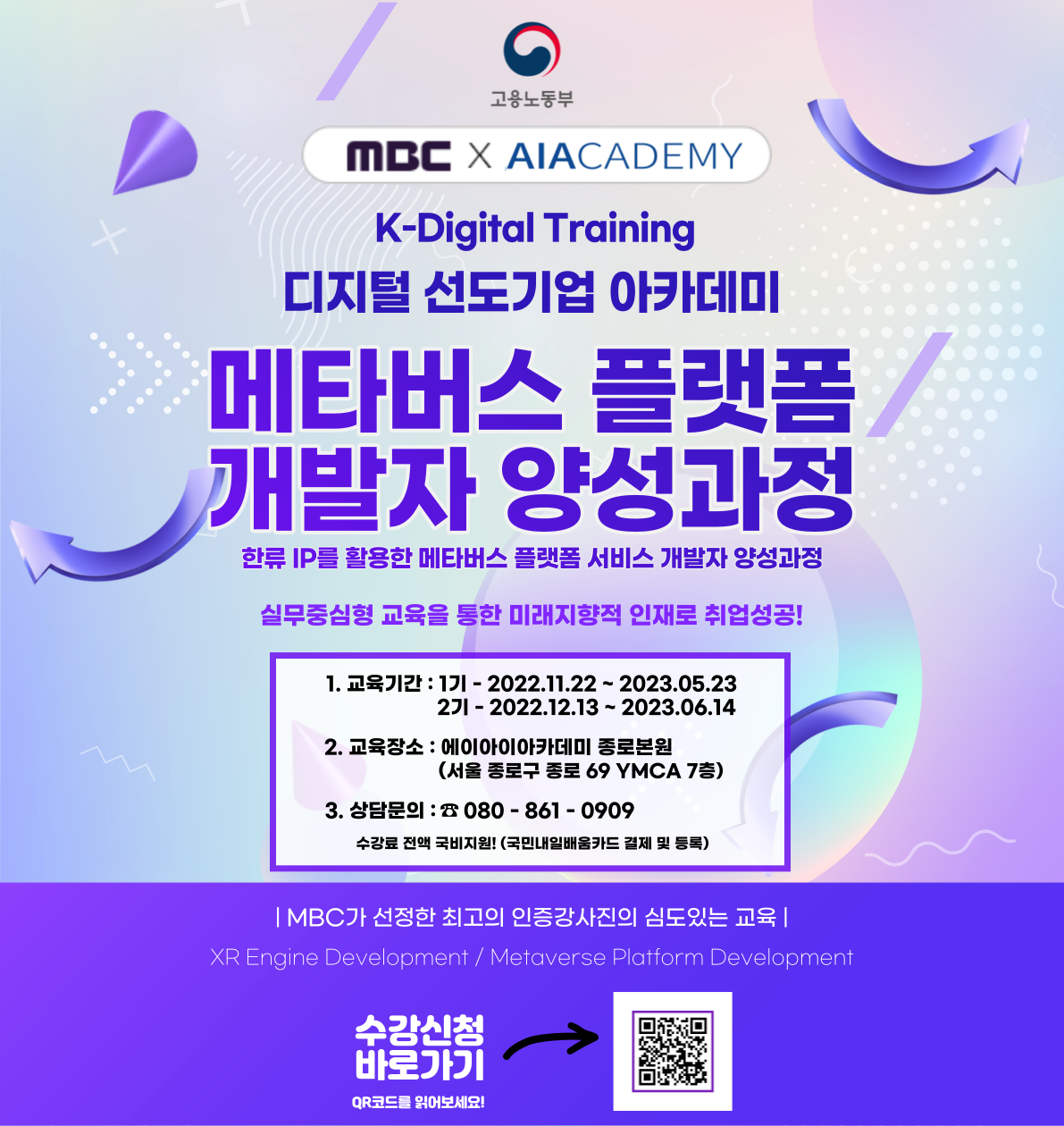 고용노동부와 MBC x AIAcademy가 개설하는 메타버스 플랫폼 개발자 양성과정 해당 과정은 MBC와 AIAcademy 협력 지원 과정으로 빠르게 발전하는 메타버스 플랫폼 개발 시장에 힘을 더해줄 교육생 양성을 목표로 하는 과정입니다. *국민내일배움카드 발급자 대상으로 진행되는 국비 지원(무료) 교육 입니다. * 강의 정보** 1. 강의명 : 메타버스 플랫폼 개발자 양성과정 - 국민내일배움카드 발급자 대상으로 진행되는 국비 지원(무료) 교육 입니다. 2. 강의기관명 : MBC x AIAcademy 3. 교육 장소 : 에이아이아카데미 종로 본원 (구 비트캠프 종로센터) / MBC 4. 대상자 : 고용보험에 가입되어 있지 않은 취업 준비생 또는 실업자 5. 공식 홈페이지 https://bit.ly/3sKiHLZ 6. 모집 기간 : 현재 \~ 2022.11.28 (월) 7. 강의 기간 : 1기 - 2022.11.22(화) \~ 2023.05.23(화) 2기 – 2022. 12. 13(화) \~ 2023. 06. 14(수) 월-금 9:30 – 18:30 (8H/1016시간/6개월) 8. 문의 번호 : 080-861-0909