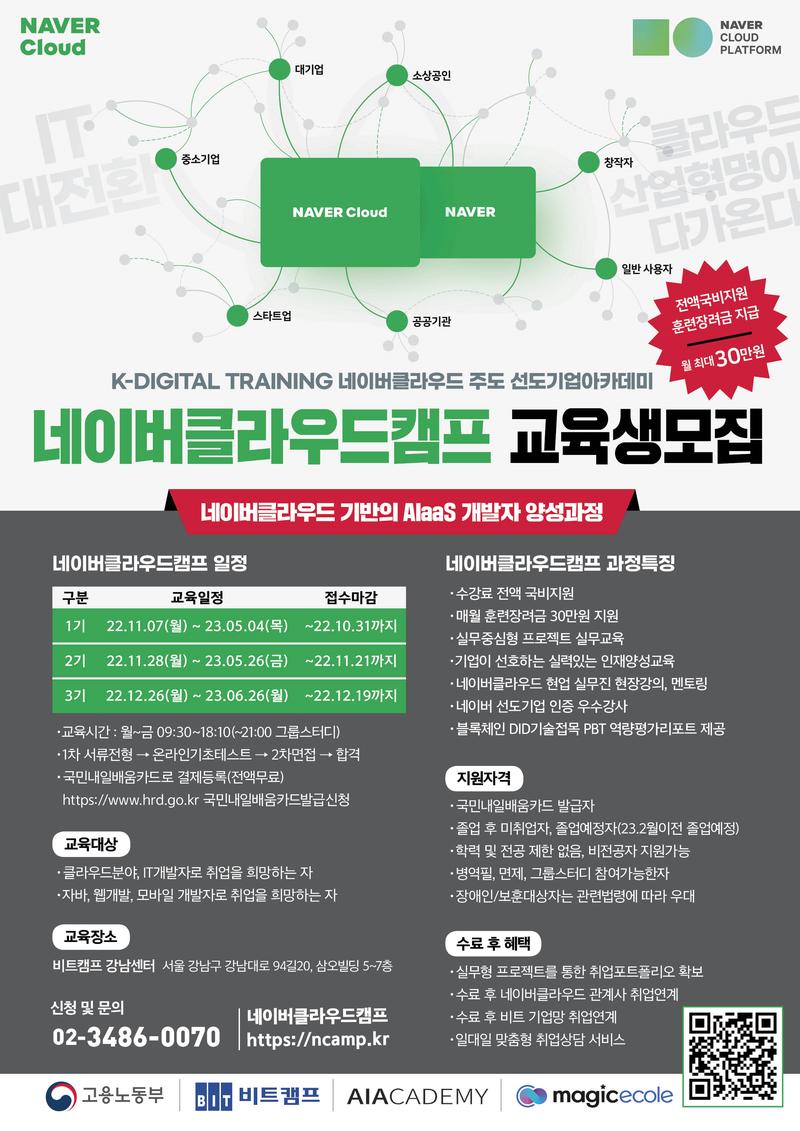 대한민국 K-Digital Training 네이버클라우드와 비트캠프가 함께합니다. 40년전통 IT인재양성의 전설 비트캠프 전문강사진 강의, 프로젝트실무중심수업,실무역량습득으로 수료 후 바로 취업까지!! 비전공자, 전공자 모두 네이버클라우드캠프로 오세요\~ ★네이버클라우드캠프 1기 교육생모집★ *과정명 : [네이버클라우드]클라우드기반AIaaS 개발자 과정 - 교육일정 : 22.11.07(월)\~23.05.04(목) - 접수기간 : 1기 현재접수중\~22.10.31(월) 18시 - 교육장소 : 비트캠프 강남센터 (주소 : 서울시 강남구 강남대로 94길20 삼오빌딩 6층) - 상담전화: 02-3486-0070 *과정특징 -전액국비지원무료 -훈련장려금 매월30만원 지급 -네이버클라우드 현업 실무진 현장강의 -40년전통 IT전문 비트캠프 유명강사 명강의 -실무중심형 프로젝트기반 수업 -수료후 네이버클라우드와 관계사, 비트인력풀IT기업 취업연계 -접수기간: 1기 현재접수중\~22.10.31(월) 18시 *자세한 교육내용 및 신청은 -네이버클라우드캠프 https://ncamp.kr 신청접수 가능! -https://bit.ly/3S8iaOj에서 신청접수 가능! -국민내일배움카드로 교육신청·참여가능! -상담전화: 02-3486-0070