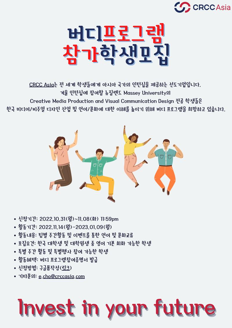 CRCC Asia는 전 세계 학생들에게 아시아 국가의 인턴십을 제공하는 선도기업입니다. 겨울 인턴십에 참여할 뉴질랜드 Massey University는 전 세계 대학평가 300위 내에 드는 유수의 대학으로, Creative Media Production and Visual Communication Design 전공 학생들이 한국에서 인턴십에 참여할 예정입니다. 인턴십 프로그램 기간동안 한국 미디어/비주얼 디자인 산업 및 언어/문화에 대한 이해를 높이고 한국 학생들과의 교류를 증진시키기 위해 버디 프로그램을 희망하고 있습니다. 글로벌학생들과의 교류를 원하는 한국 학생들의 많은 신청을 기다리겠습니다.
