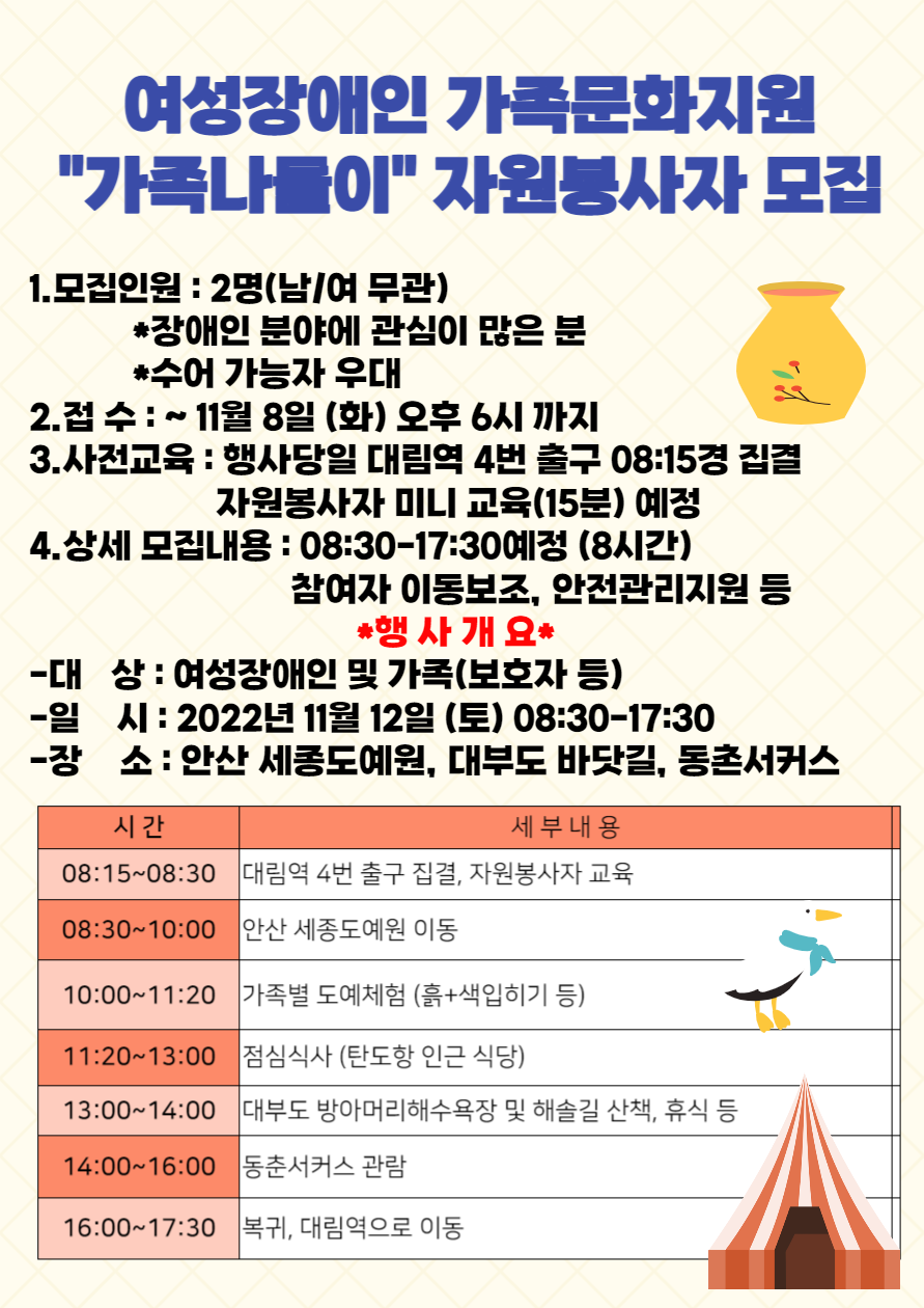 1. 일시: 2022. 11. 12(토) 08:30\~17:30(총 9시간) 2. 장소: 경기도 안산시 일대 3. 모집인원: 2명 (성별 무관) 4. 활동대상: 여성장애인 및 가족 5. 활동내용: 참여자 이동보조\, 안전관리 지원 등 6. 자격요건: - 장애인 분야에 관심이 많은 분 - 수어 가능자 우대 7. 활동보상: - VMS 봉사 실적 제공 - 점심 식사 및 간식 지원 - 정기 봉사 진행 시 연말 행사 초대\, 표창장 8. 신청방법: - 유선(010-7607-6500) 또는 봉사활동 신청페이지(https://bit.ly/3ySSSvZ) 접속 - '활동 가능 분야'에 [가족나들이] 필수 작성! 9. 봉사문의: 성인1팀 차세린 / 직통 070-4423-6124\, 업무폰 010-7607-6500