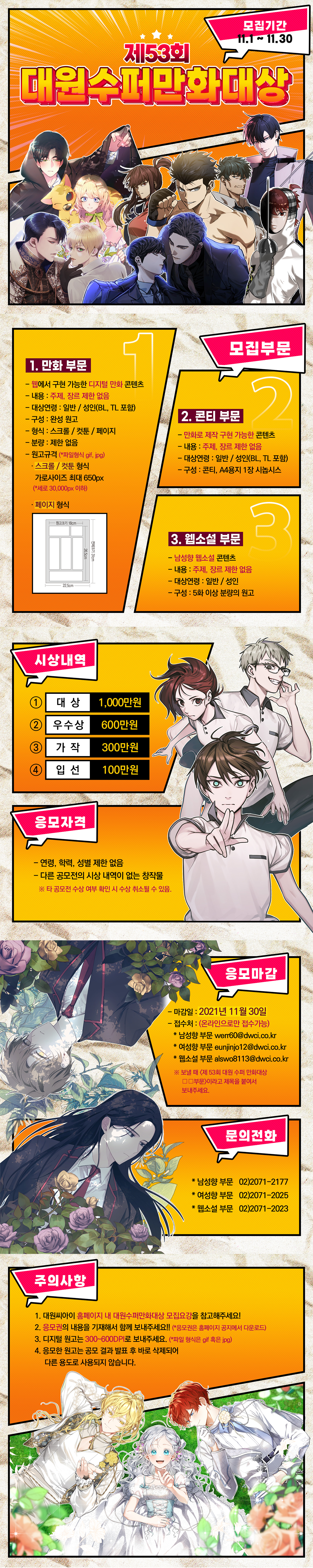 *응모마감 -마감일 : 2022년 11월 30일 -접수처 : (온라인으로만 접수 가능) 남성향 부문 werr60@dwci.co.kr 여성향 부문 eunjinjo@dwci.co.kr 웹소설 부문 alswo8113@dwci.co.kr (보낼 때 <제 53회 대원 수퍼 만화대상 ○◯부문>이라고 제목을 붙여서 보내주세요)