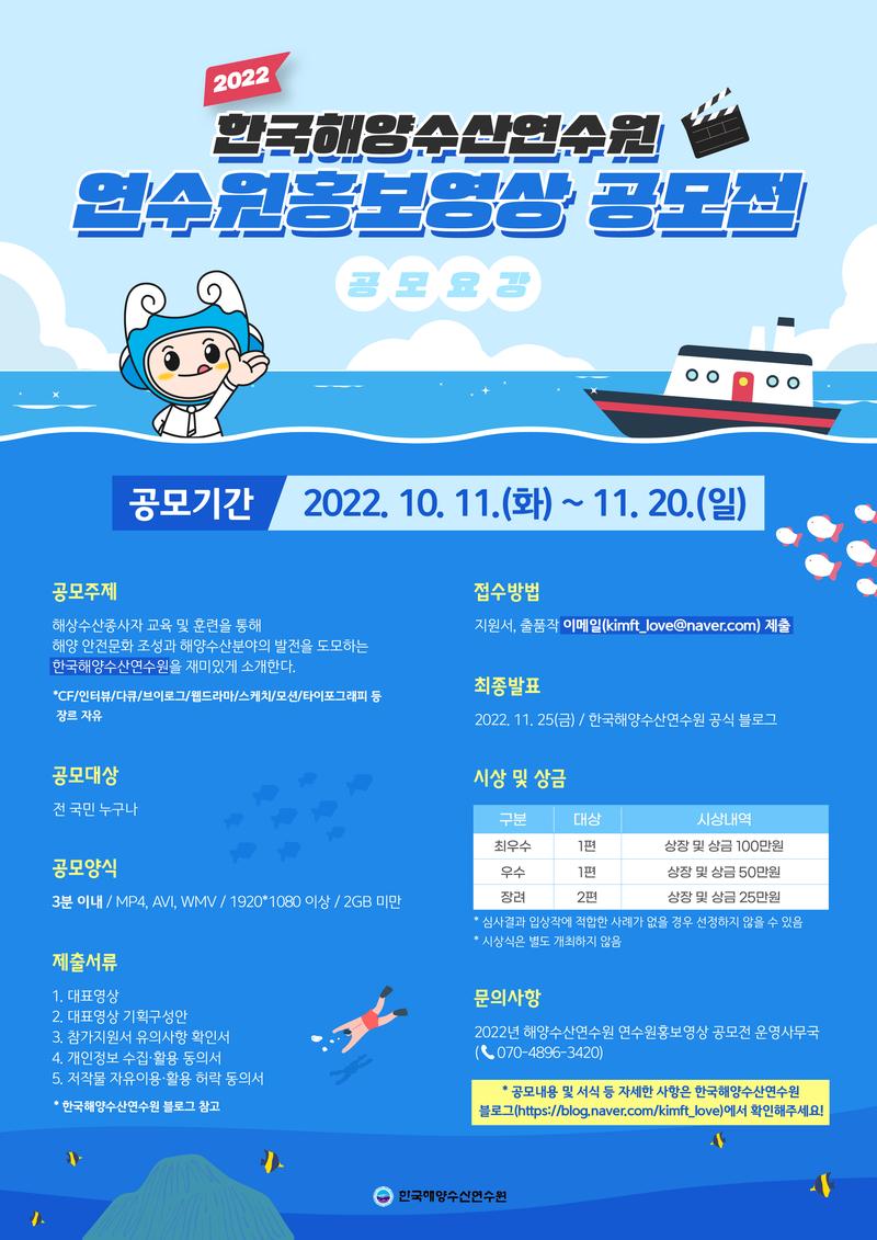2022년도 한국해양수산연수원 연수원 홍보영상 공모전이 22.10.11(화)부터 22.11.20(일)까지 6주간 진행됩니다. <공모기간> 22. 10. 11(화) ∼ 22. 11. 20(일) 6주간 <최종 발표> 22.11.25(금) / 한국해양수산연수원 공식 블로그 <공모주제> 해양수산종사자 교육 및 훈련을 통해 해양 안전문화 조성과 해양수산분야의 발전을 도모하는 한국해양수산연수원을 재미있게 소개해주세요. * (CF/인터뷰/다큐/브이로그/웹드라마/스케치/모션/타이포그래피 등 장르 자유) <공모대상> 전 국민 누구나 <접수방법> 해양수산연수원 메일로 지원양식과 결과물 제출 (이메일: kimft_love@naver.com) <제출서류> 1. 대표영상 2. 대표영상 기획구성안 3. 참가지원서 유의사항 확인서 4. 개인정보 수집·활용 동의서 5. 저작물 자유이용·활용 허락 동의서 *한국해양수산연수원 블로그 참고 <시상내역> 최우수상 : 1명(상장 및 상금 100만 원) 우수상 : 1명(상장 및 상금 50만 원) 장려상 : 2명(상장 및 상금 25만 원) * 심사결과 입상작에 적합한 사례가 없을 경우 선정하지 않을 수 있음 * 시상식은 별도 개최하지 않음 <유의사항 / 문의사항> 2022년 해양수산연수원 연수원 홍보 영상 공모전 운영사무국 (070-4896-3420) *공모내용 및 서식 등 자세한 사항은 한국해양수산연수원 블로그(https://blog.naver.com/kimft_love/222892262370)에서 확인해주세요! 국민 여러분의 많은 참여 바랍니다.
