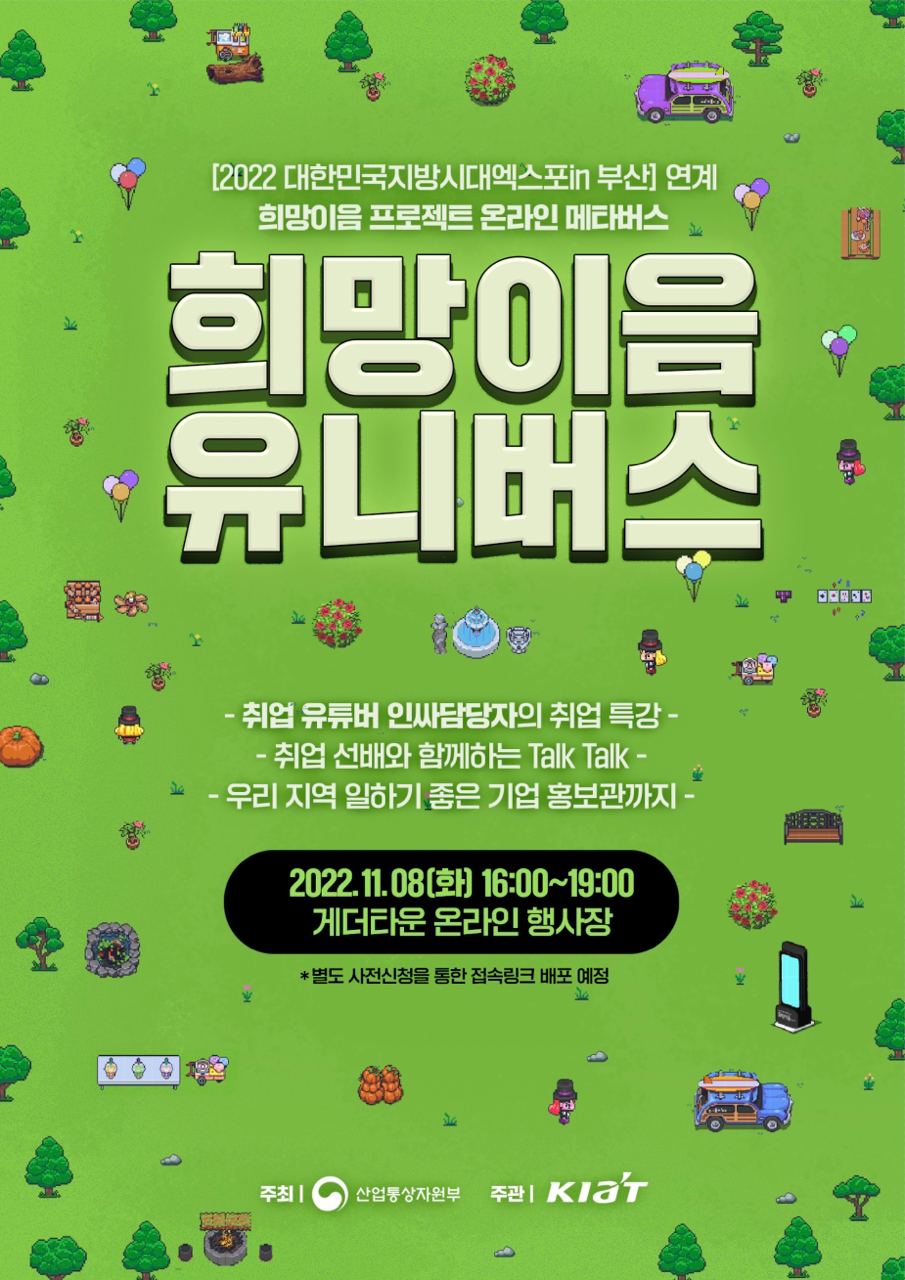 [희망이음 유니버스 in 게더타운] 🌿희망이음 유니버스 참가자 모집🌿 🌿희망이음 유니버스 in 게더타운🌿메타버스에서 취업고민을 함께 나눌 청년들을 모집합니다!! 유익한 취업 특강 및 취업 선배와의 대화부터 다양한 기업 부스 탐방까지 !! 모든 좋은 기회를 놓치고 싶지 않다면? ✨"희망이음 유니버스"를 바로 신청하세요! ✨ 👇"U쾌한 취업캠프" 신청 바로 가기👇 https://forms.gle/WAa3qWJPZCbt9MdV7 메타버스로 진행되는 희망이음 유니버스🌿게더타운에서 만날 청년들을 모집합니다!! 유익한 취업 특강 및 취업 선배와의 대화부터 다양한 기업 부스 탐방까지 !! 모든 좋은 기회를 놓치고 싶지 않다면? ✨"희망이음 유니버스"를 바로 신청하세요! ✨ 희망이음 프로젝트? 🤔 "청년의 꿈과 도전을 지역기업과 함께 만들어 갑니다!" 산업통상자원부가 담당하고 한국산업기술진흥원이 전담하여 진행하는 희망이음 프로젝트는 열정적인 청년인재를 기다리는 지역의 우수 기업과 지역의 좋은 기업을 찾고자 하는 청년 인재를 연결하는 소통 창구입니다. 2012년부터 이어져 오고 있는 대국민 프로젝트 희망이음 프로젝트는 기업의 내일, 청년의 내일을 응원합니다. 이러한 대학생에게 딱! 적합해요 🙌 ✔️ 취업에 관심이 많은 대학생 ✔️ 취업선배에게 평소 궁금했던 취업질문을 하고 답변을 듣고싶은 대학생 ✔️ 유튜버 인싸담당자의 취업 특강을 듣고 싶은 대학생 ✔️지역 우수 기업 정보를 얻고 싶은 대학생 🗓️마감기한 \~2022년 11월 6일 (일) 23시 59분까지 📌 신청일자 : 2022년 10월 28일 (금) \~ 11월 6일 (일) 23시 59분까지 📌 인원 : 00명 📌 비용 : 없음 📌 대상 : 취업에 관심있는 청년 📌 일시 : 2022년 11월 8일 (화) 오후 4시\~7시 📌 장소 : 게더타운 온라인 행사장 (신청자에 한해 접속 링크 전달 예정) 📌 **주요 프로그램 내용 :
