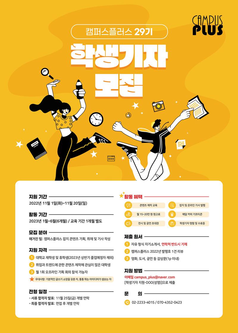 캠퍼스플러스 29기 학생기자 모집 2006년 3월 창간한 대학 문화 매거진 《캠퍼스플러스》에서 29기 학생기자를 모집합니다. 콘텐츠 기획과 제작에 관심 있는 친구, 대학 생활을 특별한 경험으로 채우고 싶은 친구라면 모두 도전하세요. 나의 이름으로 기사를 발행하며 《캠퍼스플러스》 잡지를 함께 만들어 갈 학생기자를 기다립니다. 이번 29기 지원을 놓치지 마세요!