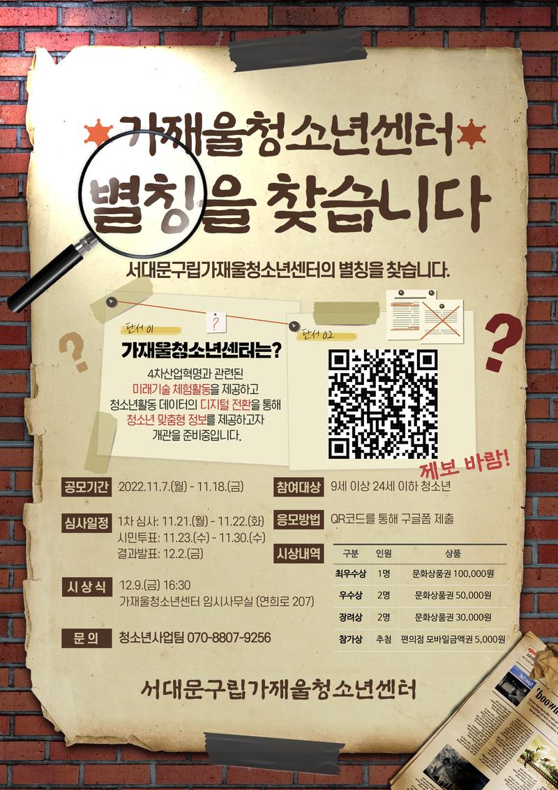 가재울청소년센터 별칭을 찾습니다! 가재울청소년센터는 4차산업혁명과 관련된 미래기술 체험활동을 제공하고 청소년활동 데이터의 디지털 전환을 통해 청소년 맞춤형 정보를 제공하고자 개관을 준비중입니다. 가재울청소년센터에 어울리는 별칭을 지어주세요! . [공모기간] 2022. 11. 7. (월) \~ 11. 18. (금) . [참여대상] 9세 이상 24세 이하 청소년 . [응모방법] 구글폼 제출 . [심사일정] 1차심사: 2022. 11. 21. (월) \~ 11. 22. (화) 시민투표: 2022. 11. 23. (수) \~ 11. 30. (수) 결과발표: 2022. 12. 2. (금) . [시상식] 2022. 12. 9. (금) 16:30 가재울청소년센터 임시사무실 (연희로 207) . [시상내역] 최우수상(1명) 문화상품권 100,000원 우수상(2명) 문화상품권 50,000원 장려상(2명) 문화상품권 30,000원 참가상(추첨) 편의점 모바일금액권 5,000원 . [문의] 가재울청소년센터 청소년사업팀 (070-8807-9256)