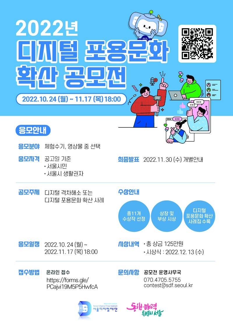 [공모전 안내] ■ 공모전명: 2022 디지털 포용문화 확산 공모전 ■ 공모기간: \~ 2022. 11. 17.(목) 18:00 ■ 응모주제: 디지털 격차해소 또는 디지털 포용문화 확산 사례 ■ 응모자격: 공고일 기준 서울시민 또는 서울시 생활권자 ■ 응모분야: 체험수기, 영상물 중 선택 ■ 접수방법: 온라인을 통한 접수 (https://forms.gle/PCajvi19M5P5HwfcA) ■ 최종발표: 2022.11.30.(수) 개별안내 ■ 시상식: 2022.12.13.(수) 더 자세한 내용은 아래 사이트 참고 부탁드립니다. https://sdf.seoul.kr/business-announce/1905