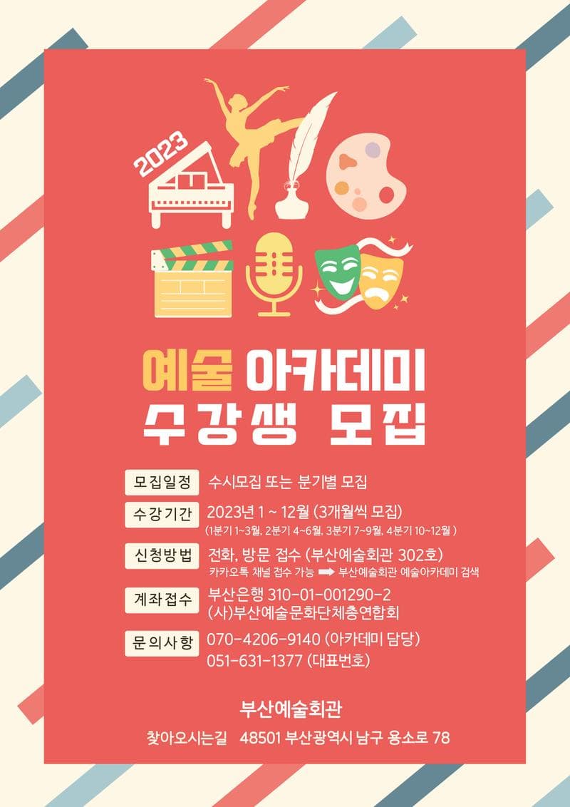 1. 신청방법 전화신청 : 070-4206-9140 (아카데미 담당) 051-631-1377 (대표번호) 카카오톡 채널 신청: 부산예술회관 예술아카데미 http://pf.kakao.com/_xbxhxbxjxj 수강생 성명 및 연락처 / 접수 후 신청완료 문자 또는 카카오톡 안내 발송예정 ★ 2022년 12/19(월) 개설강좌 확인 후 수강료 납부 (기간까지 신청인원 미달 시 폐강) 강좌별 수강 인원 10명 이상 시 개강되며 (1:1 프리미엄 피아노 클래스는 별도) 수강료 이외 재료비, 반주비, 교재비 등은 별도입니다.