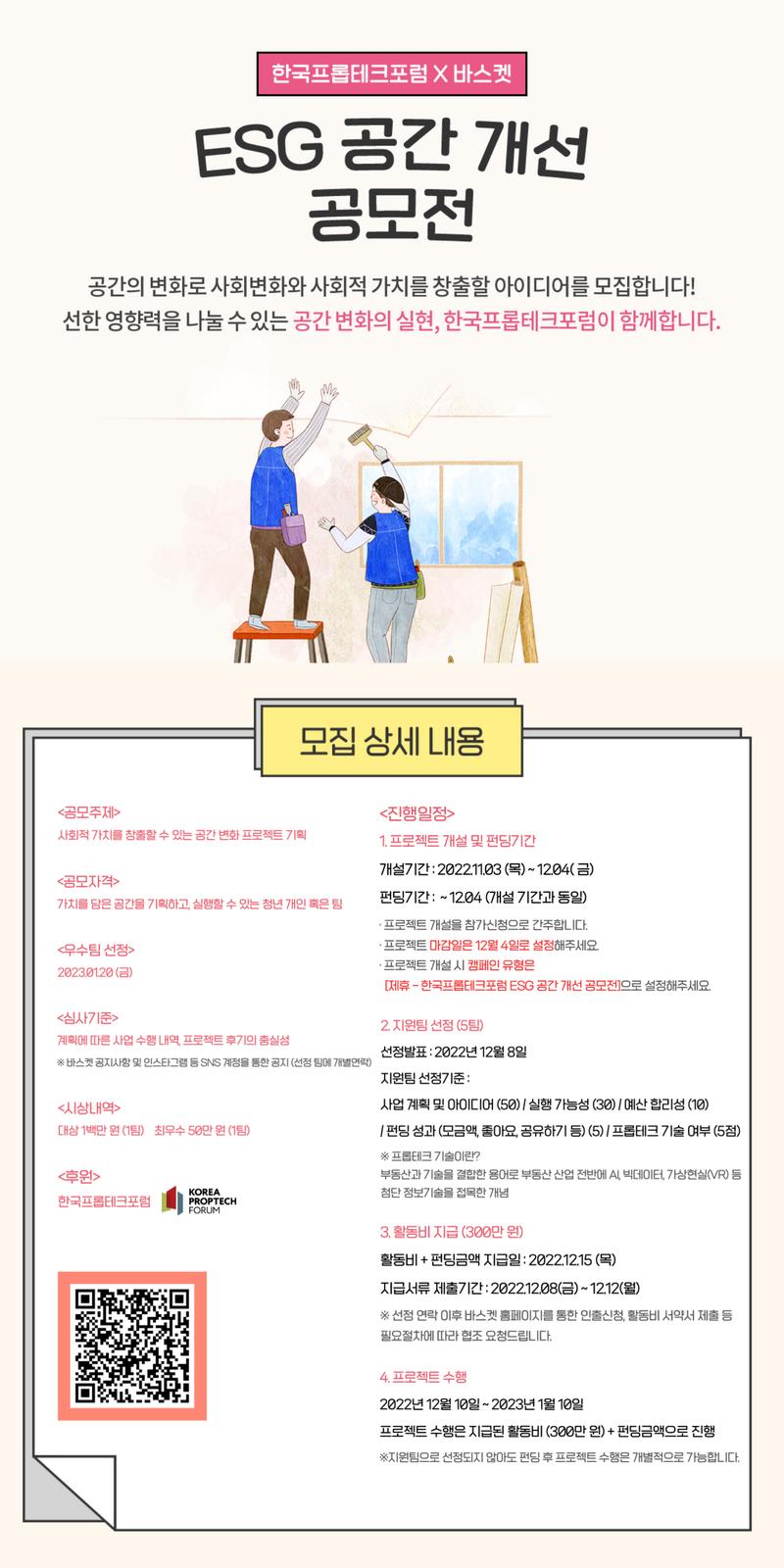 ● 공모주제 한국프롭테크포럼은 공간의 변화로 사회변화와 사회적가치를 창출할 아이디어를 모집합니다. ESG의 의미를 담아 공간의 사회공헌적 가치를 높이는 공간 개선 아이디어를 응원하고 모집합니다. ● 공모자격 가치를 담은 공간을 기획하고, 실행할 수 있는 청년 개인 혹은 팀 ● 모집인원 5팀 선정 ● 기간 및 일정 1. 모집기간 프로젝트 개설 기간 : 2022. 11. 03 (목) \~ 12. 04 (금) 프로젝트 펀딩 기간 : \~ 12. 04 (금) (개설기간과 동일) 2. 활동기간 프로젝트 수행 : 2022. 12. 10. (토) \~ 23. 01. 10.(화) ● 모집방법 Step1. ‘공간’을 변화시켜 사회적 가치를 창출할 아이디어 기획 Step2. 개인모금플랫폼 바스켓에서 프로젝트 개설(메이크)하면 공모전 참가 완료!