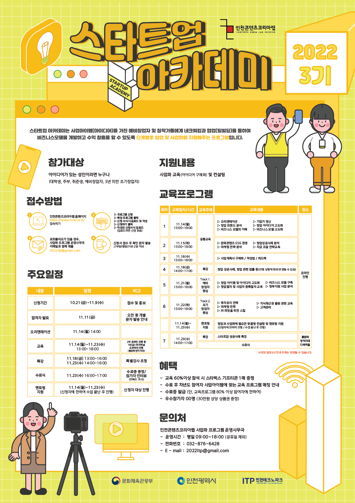 스타트업 아카데미는 사업아이템(아이디어)를 가진 예비창업자 및 창작가들에게 네트워킹과 협업(팀빌딩)을 통하여 비즈니스모델을 개발하고 수익창출을 할 수 있도록 단계별로 창업 및 사업화를 지원해주는 프로그램입니다. ○ 참가대상 - 아이디어가 있는 성인이라면 누구나 (예비창업자\, 3년 미만 초기 창업자\, 대학생\, 주부\, 취준생) ○ 지원내용 - 사업화 교육(아이디어 구체화) 및 컨설팅 ○ 주요일정 - 신청기간 : 10/21(금)\~11/9(수) 까지 (연장공고) - 유선 인터뷰 : 11/10(목) 11:00\~16:00 - 합격자발표 : 11/11(금) 11:00 - 오리엔테이션 : 11/14(월) 13:00 (온라인) - 교육 : 11/14(월) \~ 11/23일(수) 13:00\~18:00 (온라인교육 진행 및 마지막날 23일은 대면진행, 인천틈문화창작지대) - 특강&수료식 : 11/23(금) 14:00\~17:00 (대면진행, 인천틈문화창작지대) - 멘토링지원 : 11/14(월) \~ 11/23(수) 13:00\~18:00 (신청자 대상 진행하여 수업 종료 후 진행) ○ 혜택 - 교육 60%이상 참석 시 스타벅스 기프티콘 1매 증정 - 수료 후 차년도 참여자 사업아이템에 맞는 교육 프로그램 매칭 안내 - 수료증 발급(단, 교육프로그램 80%이상 참여자에 한하여) - 우수참가자 00인 (30만원 상당 상품권 증정) ○ 접수방법 1) 인천콘텐츠코리아랩 홈페이지(https://www.inckl.or.kr/) 접속 → 프로그램 신청 → 해당 프로그램 클릭 → 신청 서식 다운로드 및 작성 2) 신청하기 클릭 → 작성한 신청서식 업로드하면 신청 완료 → 접수 후 확인 문자발송(*근무일(평일) 기준 2일 이내) ※ 별도의 사업계획서가 있을 경우 인천콘텐츠코리아랩 사업화 프로그램 운영 사무국 이메일로 제출(2022itp@gmail.com) ○ 문의처 인천콘텐츠코리아랩 사업화 프로그램 운영 사무국 (032-876-6428) - 운영시간 : 평일 09:00\~18:00 (공휴일 제외) - 문의 : 032-876-6428 - 이메일 : 2022itp@gmail.com