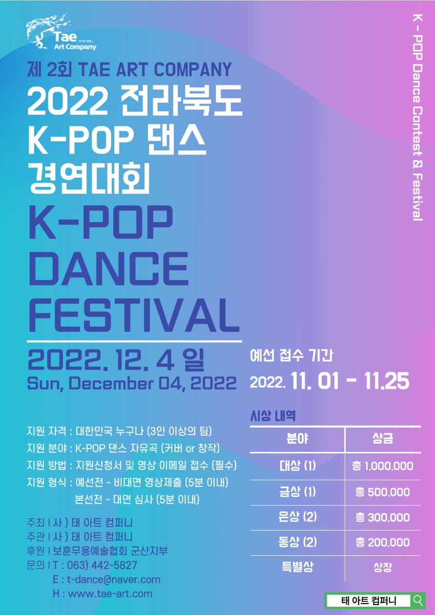 전국의 춤꾼들의 실력을 발휘할 수 있는 TAE ART COMPANY 「2022 전라북도 K-POP 댄스 경연대회」 참가자를 다음과 같이 모집하오니 많은 관심과 참여를 부탁드립니다.