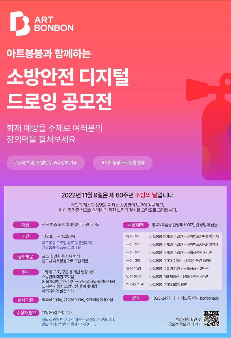 ■ 시상내역 총 48개 작품 선정 총 1,000만원 상당 시상 대상 1명: 아트봉봉 12개월(48회)수업권 + 아이패드, 애플펜슬 패키지 금상 1명: 아트봉봉 6개월(24회)수업권 + 아이패드, 애플펜슬 패키지 은상 3명: 아트봉봉 6개월(24회)수업권 + 문화상품권 3만원 동상 3명: 아트봉봉 1개월(4회) 수업권 + 문화상품권 3만원 특선 10명: 아트봉봉 2회 체험권 + 문화상품권 3만원 입선 30명: 아트봉봉 1회 체험권 + 문화상품권 3만원 참가상 (전원): 아트봉봉 1개월(4회) 50% 할인