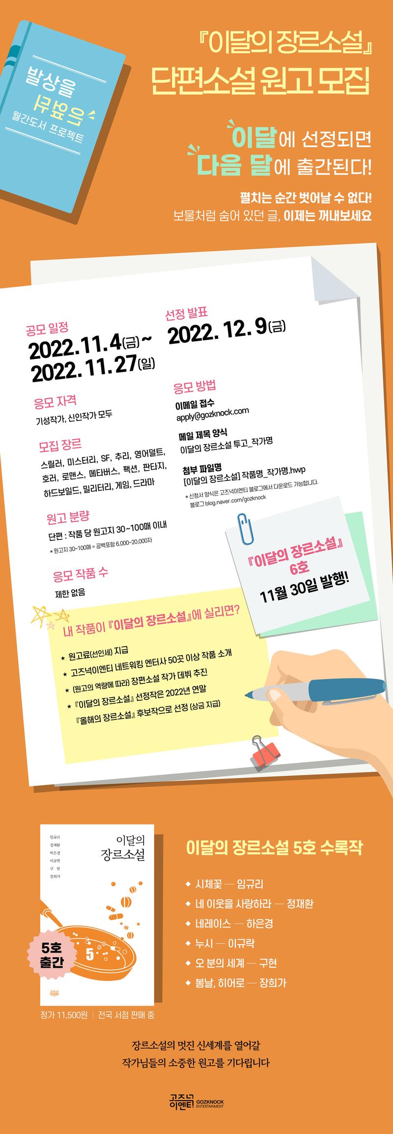 □공모 일정 응모기간: 2022. 11. 04(금) \~ 2022. 11. 27(일) 까지 발 표 일: 2022. 12. 09(금) * 선정 발표는 발표일보다 다소 시간이 소요되거나 단축될 수 있으며, 발표일 기준 ±2일 이내에 진행됩니다. □응모 자격 신인 작가 및 기성 작가 모두 가능 □모집 장르 모든 장르 (스릴러, 미스터리, SF, 추리, 영어덜트, 호러, 로맨스, 메타버스, 팩션, 판타지, 하드보일드, 밀리터리, 게임, 드라마 etc) □원고 분량 단편 - 작품 당 원고지 30\~100매 분량 이내 (공백포함 6,000\~20,000자 이내) - 응모 작품 수 제한 없음 □응모 방법 이메일 접수 apply@gozknock.com 메일 제목 양식 이달의 장르소설 투고_작가명 첨부 파일명 [이달의 장르소설] 작품명_작가명.hwp * 신청서 양식은 하단에서 다운로드 가능합니다. □문의처** 담당자 sujeong.jeong@gozknock.com