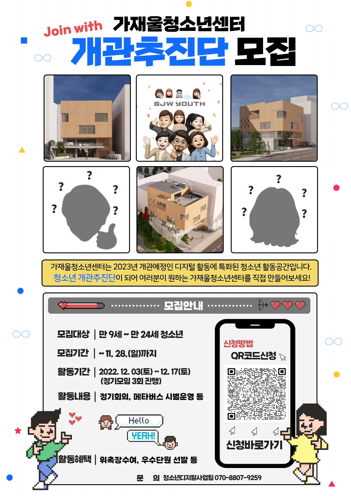 <가재울청소년센터 청소년 개관추진단 모집> 가재울청소년센터는 2023년 개관예정인 디지털 활동에 특화된 청소년활동공간입니다. 청소년 개관추진단이 되어 여러분이 원하는 가재울청소년센터를 직접 만들어보세요!