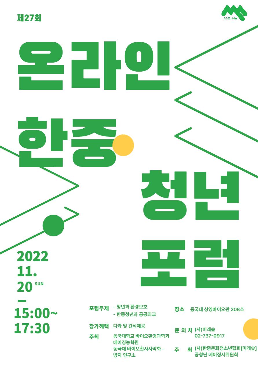 제27회 한중 청년포럼을 개최합니다. 많은 방청 바랍니다. Ο 포럼주제 : 청년과 환경보호, 한중청년과 공공외교 Ο 장소 : 동국대 상명바이오관 208호 Ο 참가 : 동국대학교 바이오환경과학과, 베이징농학원, 동국대 바이오황사 사막화방지 연구소 Ο 시간 : 2022.11.20(일) 오후 3:00 \~ 5:30