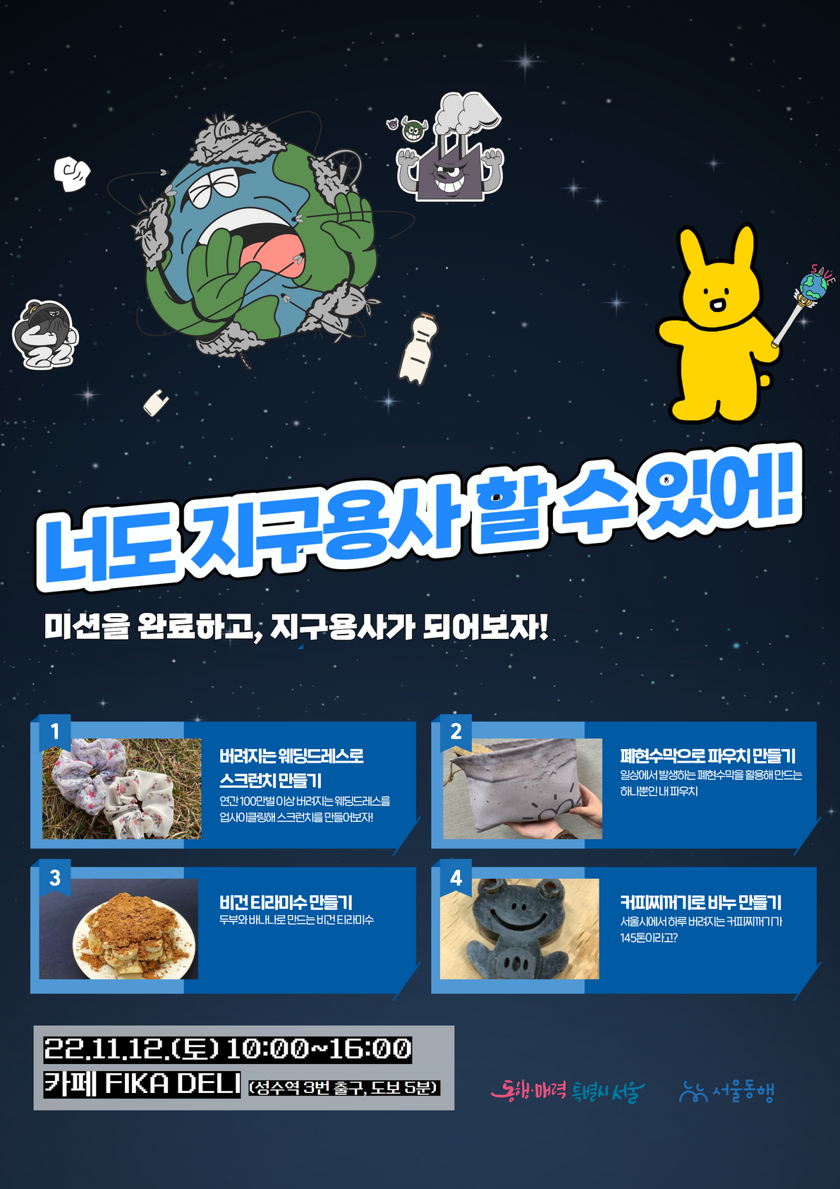 📌 내용 : 기후위기관련 체험부스(무료) ① 버려지는 웨딩드레스로 헤어 악세서리 만들기 ② 폐현수막으로 파우치 만들기 &제로웨이스트 물품 알아보기 ③ 노오븐 비건 티라미스 만들기 ④ 커피찌꺼기로 비누 만들기 ⑤ 기후위기 퍼즐 맞추기 &플라스틱 분리배출 퀴즈