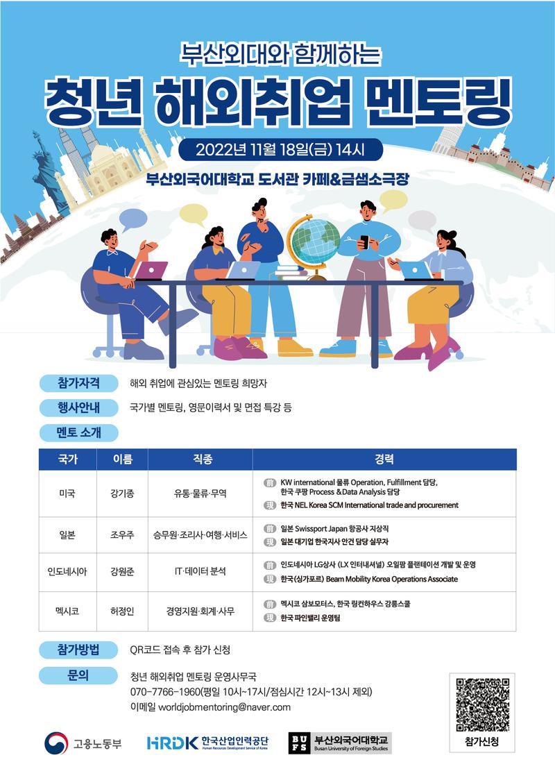 안녕하세요\~! 한국산업인력공단에서 청년 해외취업 국가별 그룹 멘토링을 진행합니다!!! 코로나로 인해 대면 행사가 힘든 요즘 시기에 해외 취업을 경험한 멘토들과 오프라인에서 진솔한 이야기를 나눌수 있는 시간을 가질 수 있습니다. 선착순으로 참여 신청을 받고 있으니 해외취업에 관심이 있는 분들은 많은 참여 바랍니다! <부산외대와 함께하는 청년 해외취업 멘토링> 💡 장소 : 부산외대 도서관 카페&금샘소극장 💡 일시 : 2022년 11월 18일(금) 14시 💡 참가대상 : 해외 취업에 관심있는 멘토링 희망자 💡 행사안내 : 국가별 멘토링, 영문이력서 및 면접 특강 등 💡 멘토링 국가 : 미국 / 일본 / 인도네시아 / 멕시코 💡 참가방법: https://url.kr/7kaoey 접속 후 참가 신청 (QR코드와 동일) 해외취업을 희망하시는 청년들의 성공을 위하여 선배 멘토들의 지식과 노하우를 들을 수 있는 자리이니 관심이 있으신 분들은 참여해주세요\~! 청년 해외취업 멘토링 운영사무국 T. 070-7766-1960 E. worldjobmentoring@naver.com (평일 10시-17시 / 점심시간 12시-13시 제외)