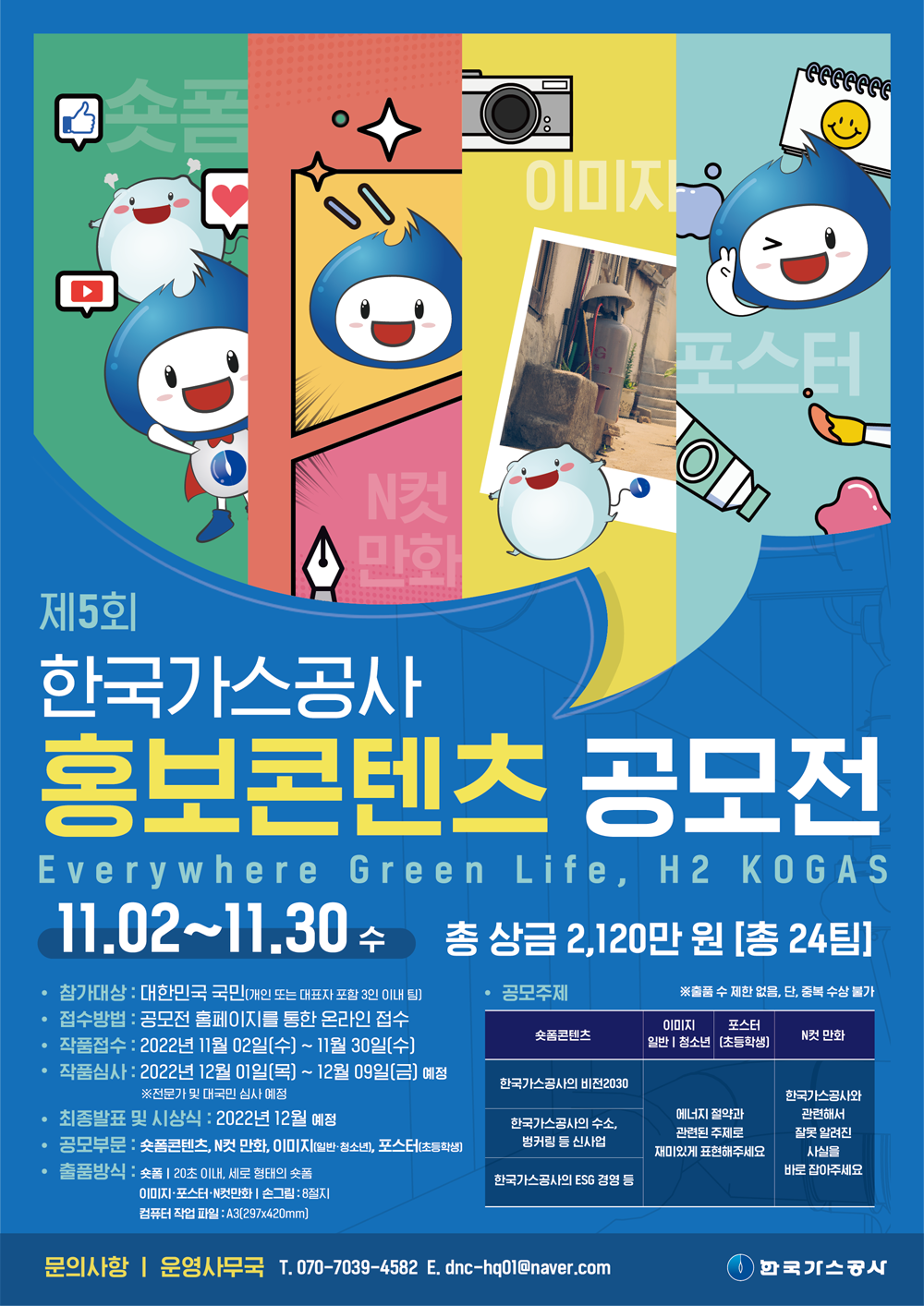 ■ 공모 내용 [숏폼콘텐츠] - 한국가스공사의 비전2030 - 한국가스공사의 수소, 벙커링 등 신사업 - 한국가스공사의 ESG 경영 등 [이미지(일반, 청소년) / 포스터(초등학생)] - 에너지 절약과 관련된 주제로 재미있게 표현해주세요 [N컷 만화] - 한국가스공사와 관련해서 잘못 알려진 사실을 바로 잡아주세요