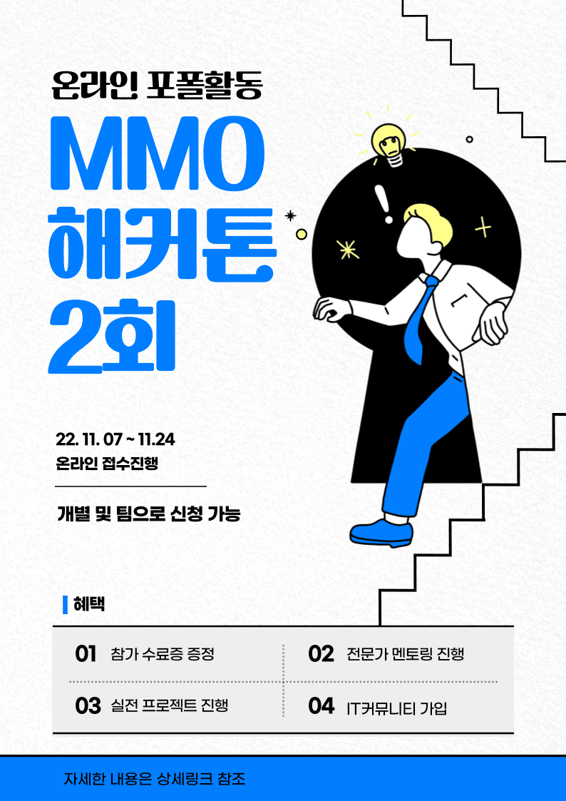 안녕하세요! IT 실무 교육을 진행하고 있는 MMO입니다. 온라인으로 개최되는 해커톤을 소개합니다. . 해커톤 진행시 중간 야식 또는 각종 혜택을 드리는 이벤트를 개최하니 재미있게 참여해주세요! . *해커톤이란? - 어원 : 해킹과 마라톤의 합성어로 짧은시간에 다양한 직군이 한 팀이 되어 주제에 맞는 결과물을 내는 활동입니다. - 장점 1) 지금까지 배웠던 방법을 사용할 수 있는 활동입니다. 2) 같은 관심사를 갖은 다양한 사람들과 커뮤니케이션을 할 수 있습니다. 3) A to Z 활동을 짧은 시간에 이룰 수 있습니다. 4) 프로젝트 진행에 대한 객관적 평가를 받아볼 수 있습니다. . *진행안내 - 무박2일간 진행이 됩니다. - 개인별 지원도 가능하니 팀빌딩은 팀빌딩 시간에 만드시면됩니다. - 모든 활동은 온라인으로 진행이됩니다. . *참가대상 - IT분야에 관심이 있는 누구나 - 개인 또는 팀으로 참가 가능 - 컴퓨터로 화상참여가 가능하신 분들 . *아이디어 주제 - 겨울에 연관된 상업적인 콘텐츠 - MZ세대들이 새해에 사용할만한 서비스 . *신청기간 : 11.03 \~ 11.24 . *해커톤 진행기간 : 11.26 10:00 \~11.27 15:00 . *해커톤 참가비 : 1인당 가격입니다. - 일반참가자 : 10\,000원 . *해커톤 스케줄 - https://morning-kayak-412.notion.site/MMO-2-11-24-3151dfe270c44340ae8113e09052269a . *해커톤 시상 : 마지막날 발표를 통한 심사로 순위에 따른 시상 진행 - 대상 : 100\,000원 - 우수상 : 50\,000원 - 아이디어상 : 30\,000원 (오직 신박한 아이디어로 구현률이 높은분께 드리는 상) . *신청링크 : https://forms.gle/xzjeiNmp47x37Kiw7 . *혜택 - 참가만 하여도 해커톤 참여 수료증 지급 - 전문가 멘토링 . *진행에 도움을 위해 각분야 전문가 3분 1) 기획 경력 8년차 2) 디자인경력 20년차 3) 개발경력 5년차