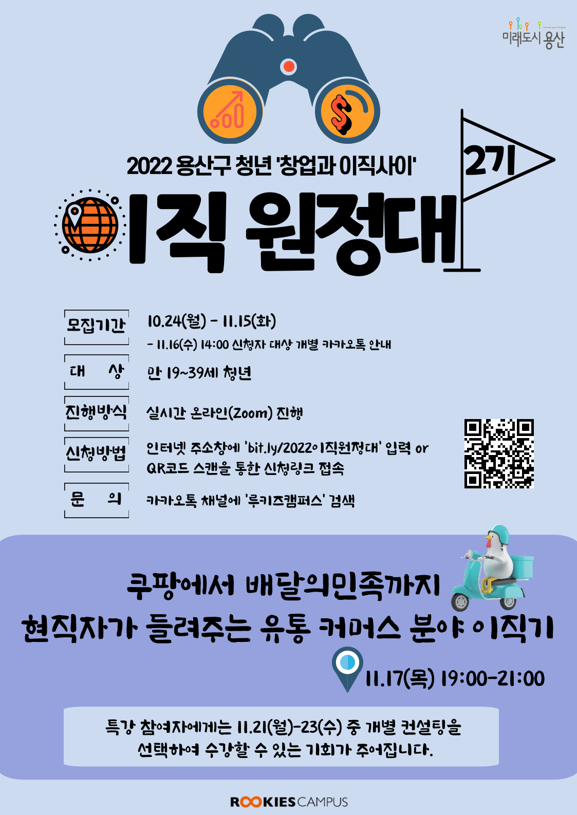 이직을 준비하는 여러분, 혹은 지난 전공 & 인턴 경험과는 다른 산업 및 직무군으로의 취업을 원한다? 여러분을 위한 이직원정대 2기 OPEN! WHAT'S COMING? 쿠팡에서 배달의민족까지 <현직자가 들려주는 유통 커머스 분야 이직기> - 국내 대표 커머스 플랫폼에서의 이직기 - 앞으로의 유통 커머스 분야 전망 - 기존 전공\, 인턴\, 경험과 다른 분야로의 취업을 원한다면? 이렇게 나아가면 됩니다. - 유통 커머스 기업 취업 성공 Tip WHEN & HOW? 11.17(목) 19:00-21:00 실시간 온라인(zoom) 진행됩니다. 특강에 참여하신 분들에게는 11.21(월)-23(수) 중 개별 컨설팅을 선택하여 수강할 수 있는 기회가 주어진다고 합니다! 커리어 전환 상담, 입사서류 점검, 면접 심층 컨설팅 등 다양한 이직 관련 정보를 얻어가고 개별 컨설팅도 받을 수 있는 이번 이직원정대 2기. 마감 전 신청하세요! https://forms.gle/SKNu1X5jDtFhtiRn9