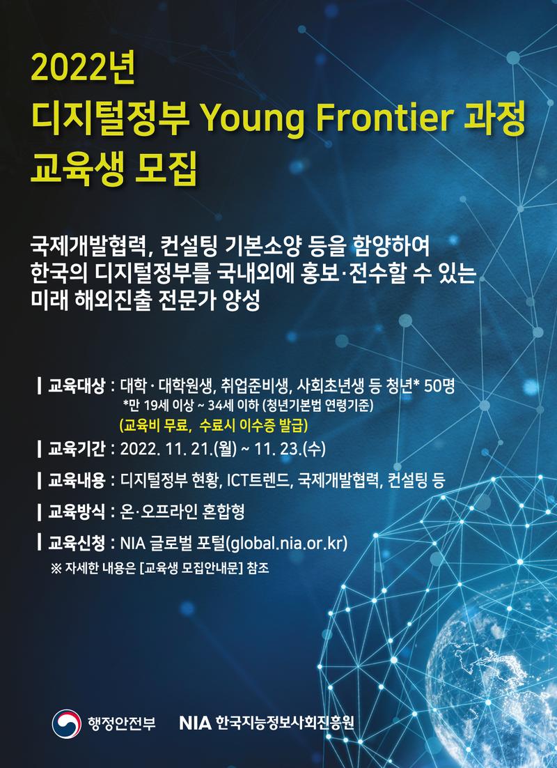 □ 교육과정 소개** o (과정명) 2022년 디지털정부 Young Frontier 과정(2차) o (대상) 대학·대학원생, 취업준비생, 사회초년생 등 청년* 50명 * 만 19세 이상 ~ 34세 이하 (청년기본법 연령기준) o (기간) ‘22. 11. 21(월) \~ 11. 23(수) 3일 과정 o (교육방법) 실시간온라인(ZOOM)/오프라인(서울 중구 바비엥2 교육센터 컨퍼런스룸) o (교육비) 무료 o (접수기간) \~ 11. 18(금), 10시까지 ※ 자세한 내용은 p.4 [교육신청안내] 참조 o (교육내용) 디지털정부, ICT, 국제개발협력, 컨설팅 등 8개 과목 [ 교육내용 요약 ]