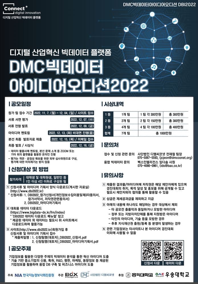 9. 추진 일정 - 사업 공고 : 11월 07일(월) \~ 12월 04일(일) - 접수 마감 : 12월 04일(일) 24:00 - 서류 심사 : 12월 07일(수) - 본선 진출 선정발표 : 12월 09일(금) - 멘토링 : 12월 13일(화) 비대면 진행(ZOOM) - 본선 진출자 발표자료 제출: 12월 15(목) 18시까지 - 결선 최종 PT : 12월 16일(목) - 시상식 : 12월 16일(목) ※ 데이터 활용 사례 멘토링, 본선 문제 소개 등 ZOOM 또는 기타 회의 플랫폼을 활용한 온라인 진행 ※ 평가는 객관 공정성 확보를 위한 외부 심사 위원으로 구성, 평가에 대한 이의 제기는 받지 않음 ※ 전 일정과 내용은 운영 기관의 사정 등에 의해 변경될 수 있습니다 10. 유의 사항 제출된 결과물/아이디어에 저작권은 해당 제안자에게 있으며 경진대회의 취지, 목적 달성 및 홍보를 위해 공개될 수 있고 필요 시 제안자와의 협의를 통해 활용할 수 있음. ◦ 상금은 제세 공과금을 제외하고 지급 ◦ 아래의 내용에 하나라도 해당하는 경우 지원 및 대상에서 제외됨. - 타 공모전에 유사하거나 동일하거나 모방한 아이디어 - 정부 또는 지방자치단체를 통해 지원 받은 아이디어 - 타인의 아이디어, 기술 등을 모방한 경우 - 추후 지식 재산권 출원/등록 등 분쟁이 발생하는 경우 ◦ 관련 기업 정보는 타 사이트나 본 아이디어 경진대회 이외에 사용될 수 없음. 11. 문의 처 - 2022년 DMC 빅데이터 아이디어 오디션(DBI2022) ※ 접수 및 신청 관련 문의 ◦ 기 관 명 : (사)디엠씨코넷 (주관사) ◦ 담 당 자 : 전채철팀장 ◦ 전 화 : 070-5067-4734 ◦ 이 메 일 : jjc@dmcconet.org ※ 데이터 관련 문의 ◦ 기 관 명 : ㈜벡스인텔리전스 ◦ 담 당 자 : 임다솜 사원 ◦ 전 화 : 070-4006-0962 ◦ 이 메 일 : ids@bax.co.kr