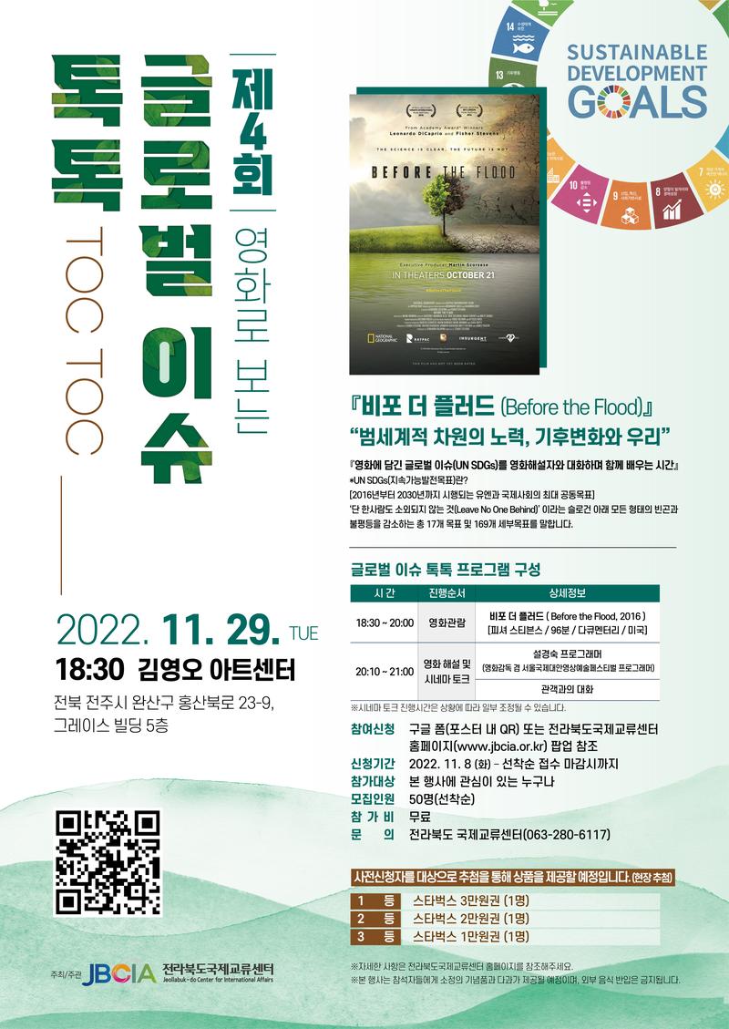 2022년 제4회「영화로 보는 글로벌 이슈 TOC TOC」 참여자 모집 전라북도국제교류센터에서는 전북 도민의 글로벌 시민의식 제고를 위해 다양한 글로벌 이슈를 주제로 한 영화상영 및 토크콘서트인 「영화로 보는 글로벌 이슈 TOC TOC」을 개최합니다. 1. 행 사 명: 제4회「영화로 보는 글로벌 이슈 TOC TOC」 2. 행사일정: 2022. 11. 29.(화) 18:30\~21:00 3. 행사장소: 김영오 아트센터(전북 전주시 완산구 홍산북로 23-9, 그레이스빌딩 5층) 4. 행사내용 - 영화「비포 더 플러드 ( Before the Flood )」관람 - 영화 및 영화 속 글로벌 이슈 주제(기후변화/행동)에 관한 영화해설 및 자유대화 - 영화 모더레이터: 영화감독 겸 서울국제대안영상예술페스티벌 설경숙 프로그래머 5. 사전신청자를 대상으로 추첨을 통해 아래에 상품을 제공할 예정(현장추첨) - 1등: 스타벅스 3만원권(1명) - 2등: 스타벅스 2만원권(1명) - 3등: 스타벅스 1만원권(1명) 6. 신청링크 바로가기: https://forms.gle/wYiYvufEJdSxe7pn9 7. 문 의 처: 전라북도국제교류센터 국제진흥팀(063-280-6117) *참가비 무료 *소정의 기념품과 다과 제공예정입니다.