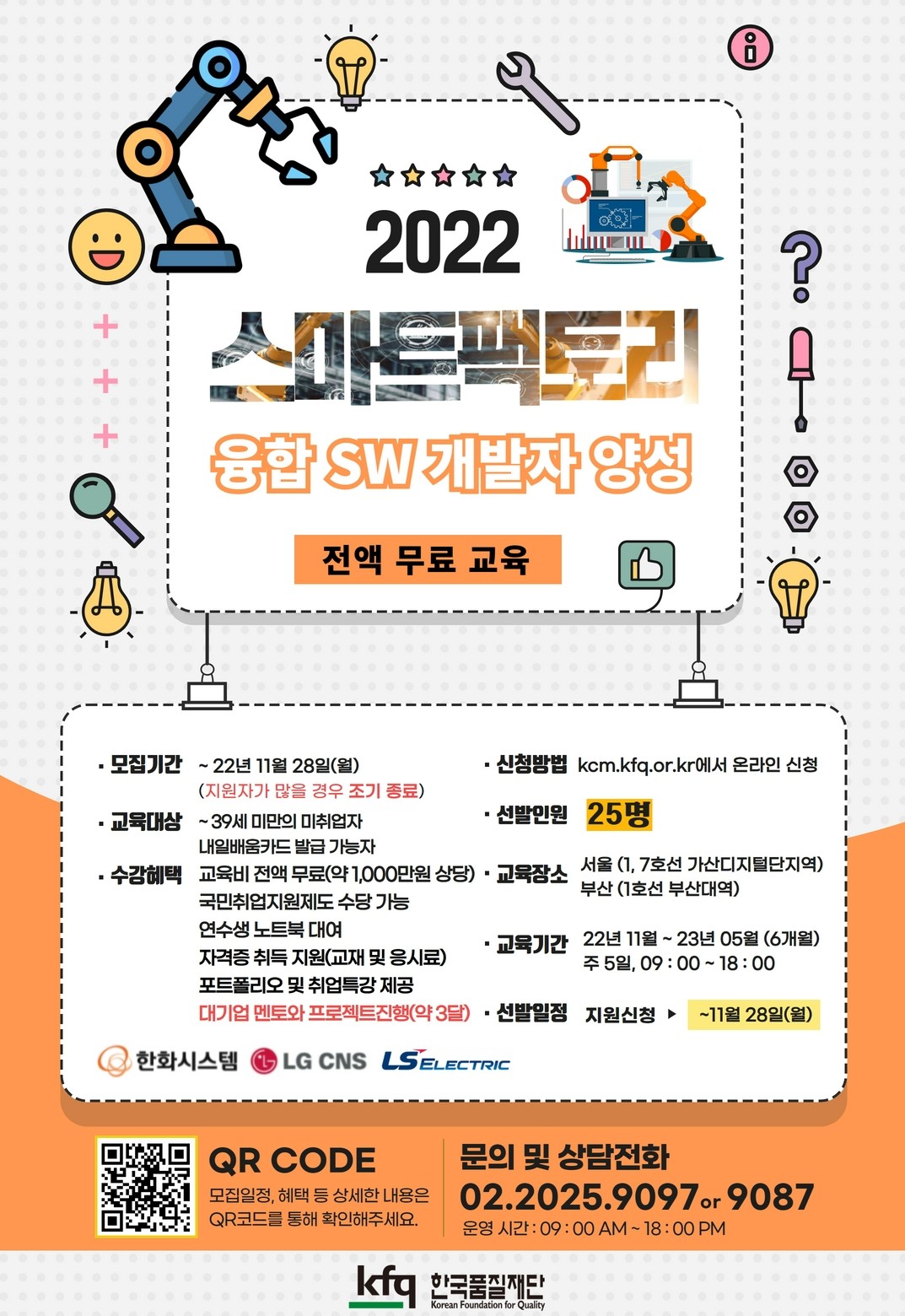 -한국품질재단 / K-Digital Training 기업맞춤형 스마트팩토리 SW 개발자 양성 과정 ▶ 활동내용 또는 응모주제 전액 국비지원 교육으로, 체계적인 커리큘럼을 통하여 스마트팩토리 SW(MES 등) 개발자로 제조, IT 업계로의 취업을 목표로 함. ○ 모집 기간 : \~ 11.28(월) ○ 모집 인원 : 각 25명 ○ 모집 대상(+졸업생 가능여부) 1. 내일배움 카드 발급 대상자(*필수) 2. 대한민국 청년 구직자(39세 미만) 3. 비전공자 지원 가능 4. 졸업자 또는 졸업 예정자(수료 즉시 취업이 가능한 자) 5. 실업자/미취업자/취업준비생/구직자 ○ 참가 비용 유/무 교육비 전액 무료(약 1,000만원 상당) ○ 우대 사항 컴공, 통계학과, 기계공학과 등 과정과 관련된 이해가 있는 인원 ○ 활동 지역 서울 : 한국품질재단 본사 강의장 - 가산디지털단지역(1, 7호선) 인근 부산 : 한국품질재단 부산대역 강의장 ○ 활동 기간 2022.11. \~ 2023.05. (6개월, 960시간) ○ 활동 혜택 -교육비/교재비 전액 지원 -최신사양 노트북 제공 -자격증 취득 관련 지원 -대기업 멘토와 최종 프로젝트 진행 ○ 오프라인 모임 횟 수 (월 x회) 주 5일 수업 중 주 3회 대면 수업 예정 ○ 지원 방법 지원 사이트 : http://kcm.kfq.or.kr** ○ 문의처 문의 : 02-2025-9081 \~ 4**
