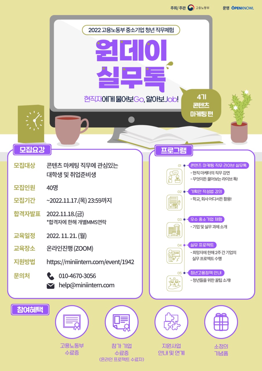 ▷활동혜택 - 고용노동부 수료증 - 참가 기업 수료증 - 콘텐츠 마케팅 직무에 대한 실무 프로젝트 경험 - 지원 사업 안내 및 연계 - 소정의 기념품