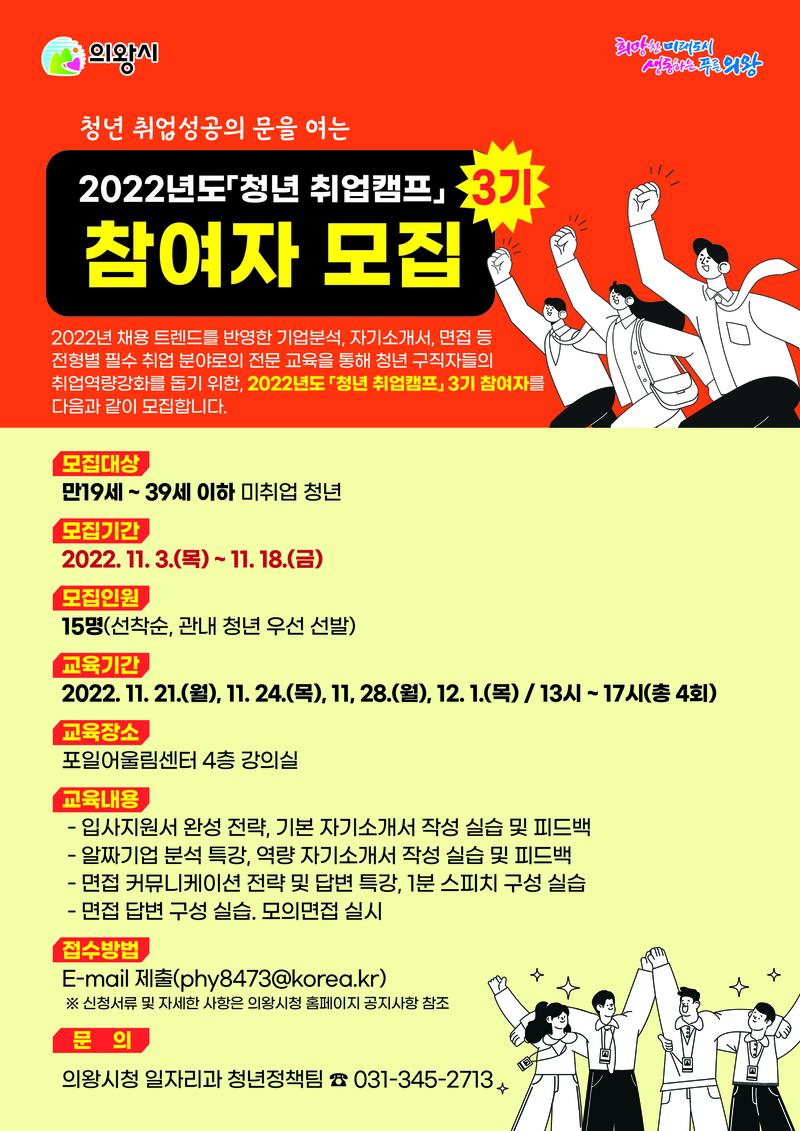 [의왕시] 입사지원 서류, 면접 등 맞춤형 취업 코칭 진행 '청년 취업캠프 3기' (대면) (\~11/18, 선착순 모집)