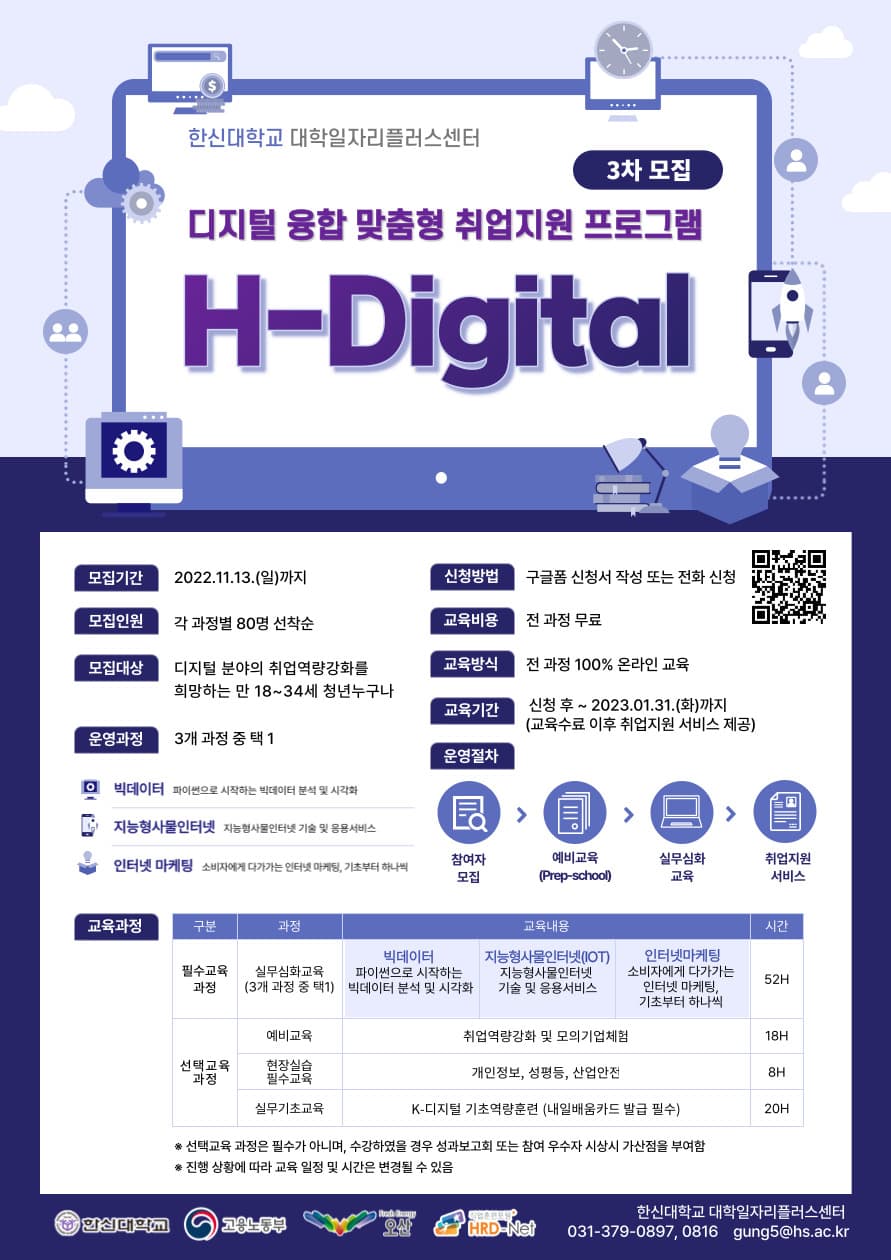 디지털 융합 인재를 양성하고, 디지털 분야로의 취업을 희망하는 대학생 및 청년층을 대상으로 실무 교육과 취업지원 서비스를 통합하여 제공하는 H-Digital 프로그램을 아래와 같이 운영합니다.