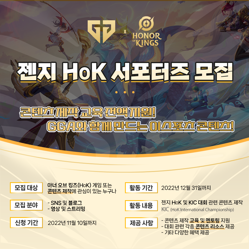 ``` 젠지와 함께 이스포츠 콘텐츠를 만들자! 콘텐츠 제작 교육 전액을 지원합니다. 분야별 주 1회 1:1 멘토링 및 피드백 세션과 카테고리 별 특별 강사의 특강까지!