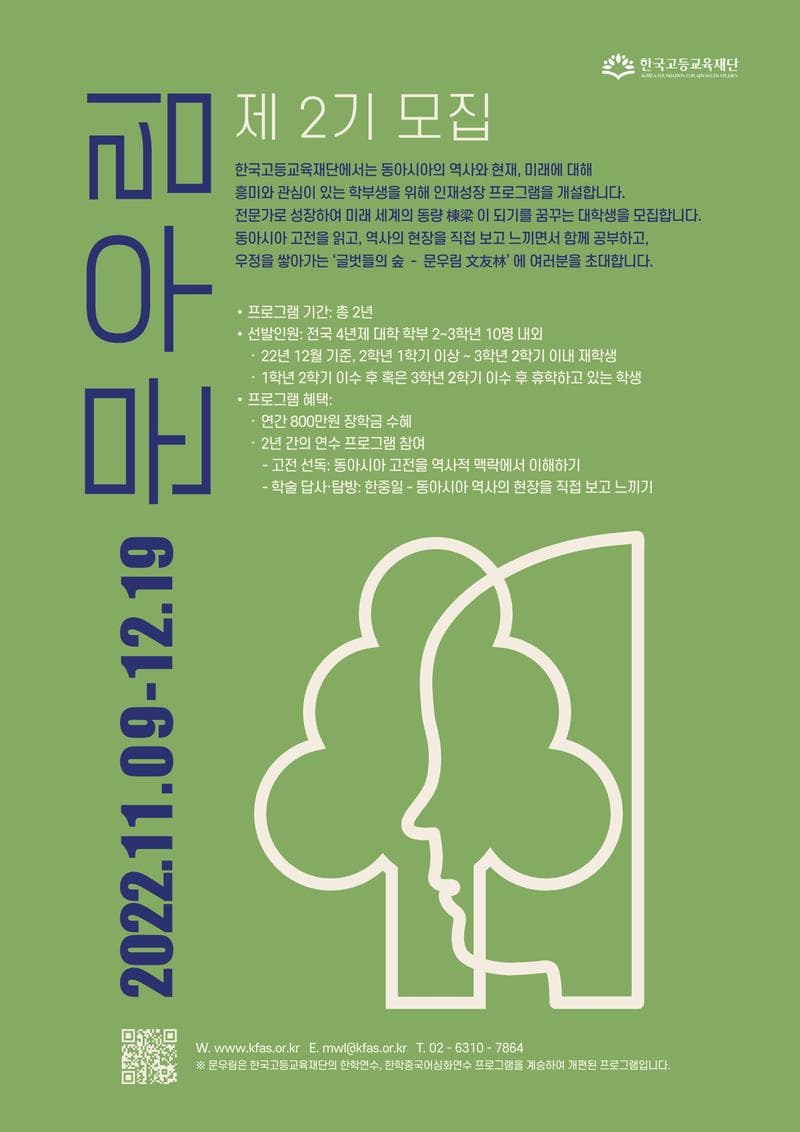 한국고등교육재단에서 제2기 문우림 장학생을 아래와 같이 선발하오니 관심 있는 학생들의 지원 바랍니다. 한국고등교육재단은 우수한 학자를 양성하여 학문발전에 기여하고자 1974년 故 최종현 SK그룹 선대회장이 설립한 비영리 공익법인입니다. 1. 문우림 개요 1) 목적: 동아시아의 역사와 현재, 그리고 미래에 관해서 남다른 흥미와 관심이 있는 학부생을 선발하여 사회 각 분야의 전문가로 성장할 수 있도록 지원 2) 프로그램 기간: 총 2년(2023년 3월 \~ 2025년 2월) 3) 선발인원: 전국 4년제 대학 학부 2\~3학년 10명 내외(대한민국 국적자) 4) 지원기간: 2022년 11월 09일(수) \~ 12월 19일(월) 11:59pm 5) 프로그램 혜택 - 연간 800만원 장학금 수혜(타 기관과의 중복수혜 가능) - 2년간의 연수 프로그램 참여 2. 모집 안내 및 지원 방법 1) 세부 모집요강 및 FAQ: Notion 페이지 (온라인 Q&A DAY 참가 신청) https://powerful-belly-09f.notion.site/2-2d0391e69361492781d428fa756ed641 2) 온라인 지원: https://apply.kfas.or.kr/ 3) 선발일정 - 온라인 지원: 2022년 11월 09일(수) \~ 12월 19일(월) 11:59pm - 면접 전형: 2023년 1월 11일(수) - 최종합격자 발표: 2023년 1월 말 - 프로그램 시작: 2023년 2월 말(2월 중순 오리엔테이션 진행 예정) 4) 지원문의: mwl@kfas.or.kr (혹은 https://powerful-belly-09f.notion.site/2-2d0391e69361492781d428fa756ed641)