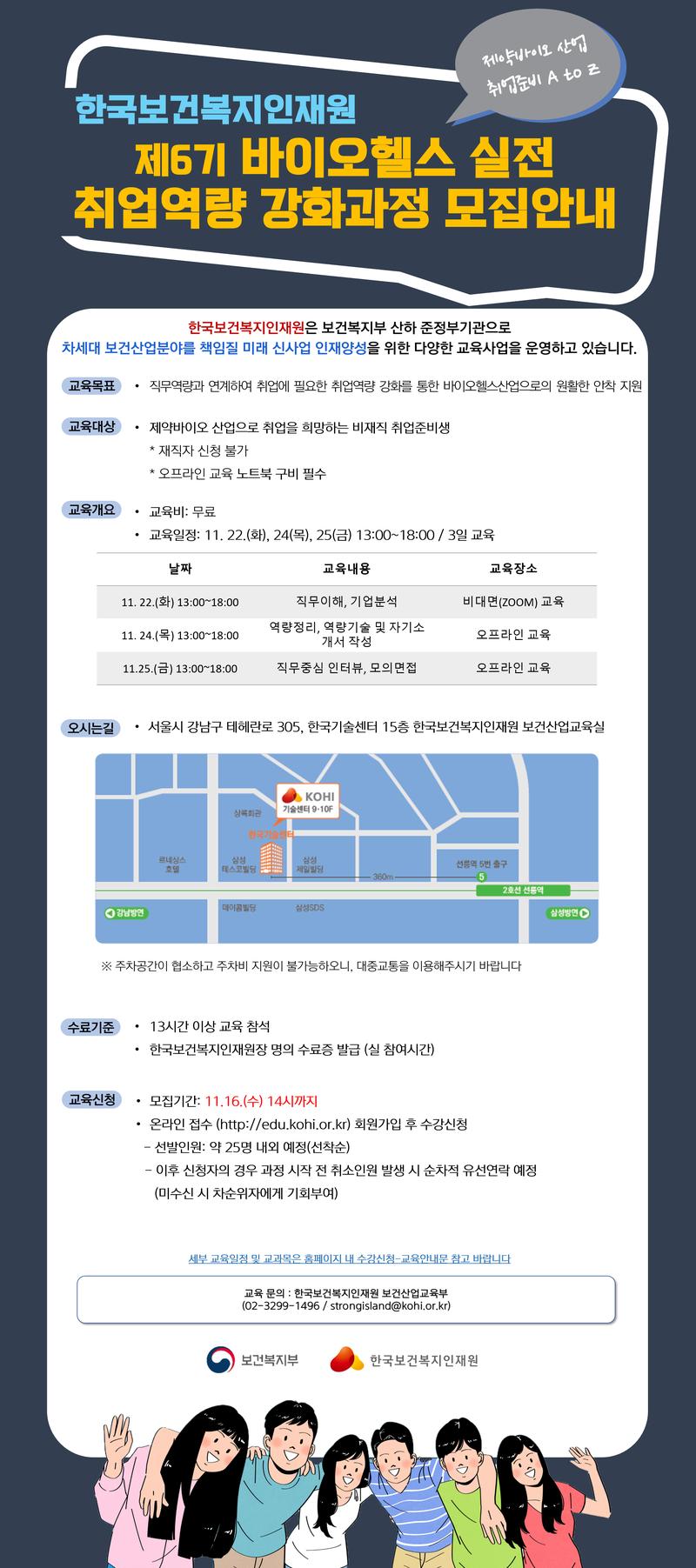 안녕하세요! 한국보건복지인재원입니다. 제약바이오 분야에 취업을 희망하는 취준생분들을 대상으로, 산업/직무맞춤형 취업역량강화 교육을 개설하였으니 많은 관심 부탁드립니다\~!